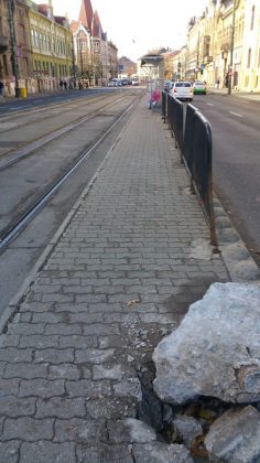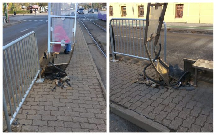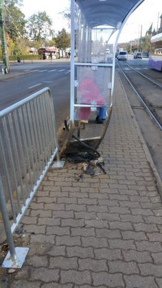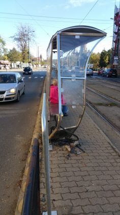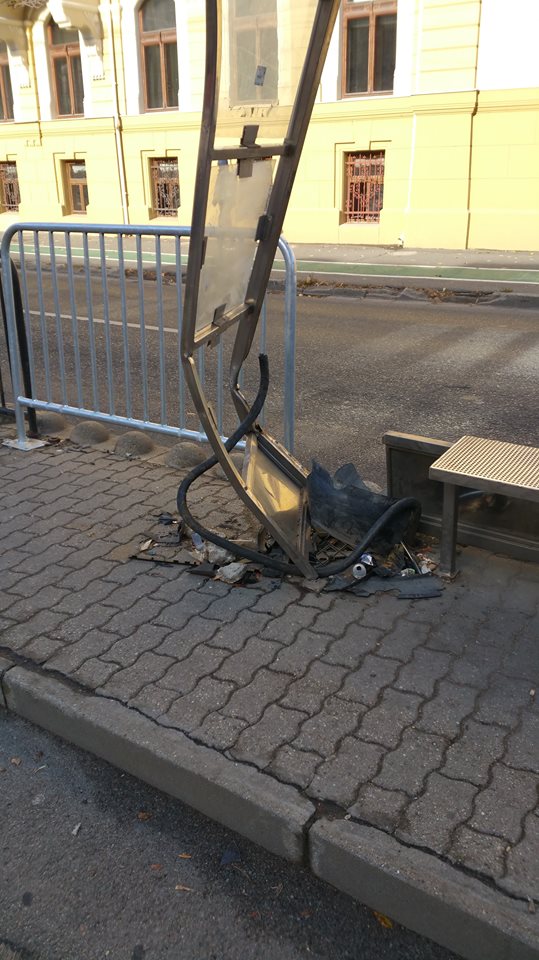 Refugiul pentru călători este serios iîndoit și un geam lipsește. Stâlpul pe care era până de curând panoul de afișaj electronic, nu mai există. Acesta a fost smuls din pavaj cu tot cu fundația de ciment. Totul din cauza unui accident rutier.