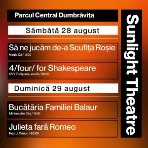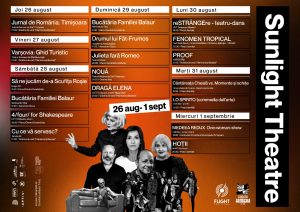Așadar, deschiderea secțiunii de teatru va avea loc joi, 26 august 2021, cu spectacolul „Jurnal de România.Timișoara”, în Grădina de vară a Filarmonicii Banatul. Maia Morgenstern, Marian Râlea, Dana Rogoz, Claudiu Istodor, Rodica Mandache, Florentina Țilea, Ionuț Vișan, Elvira Deatcu, Ioana Bugarin, Ruxandra Maniu sunt câteva dintre numele sonore ale teatrului românesc care vor urca pe scena Sunlight.