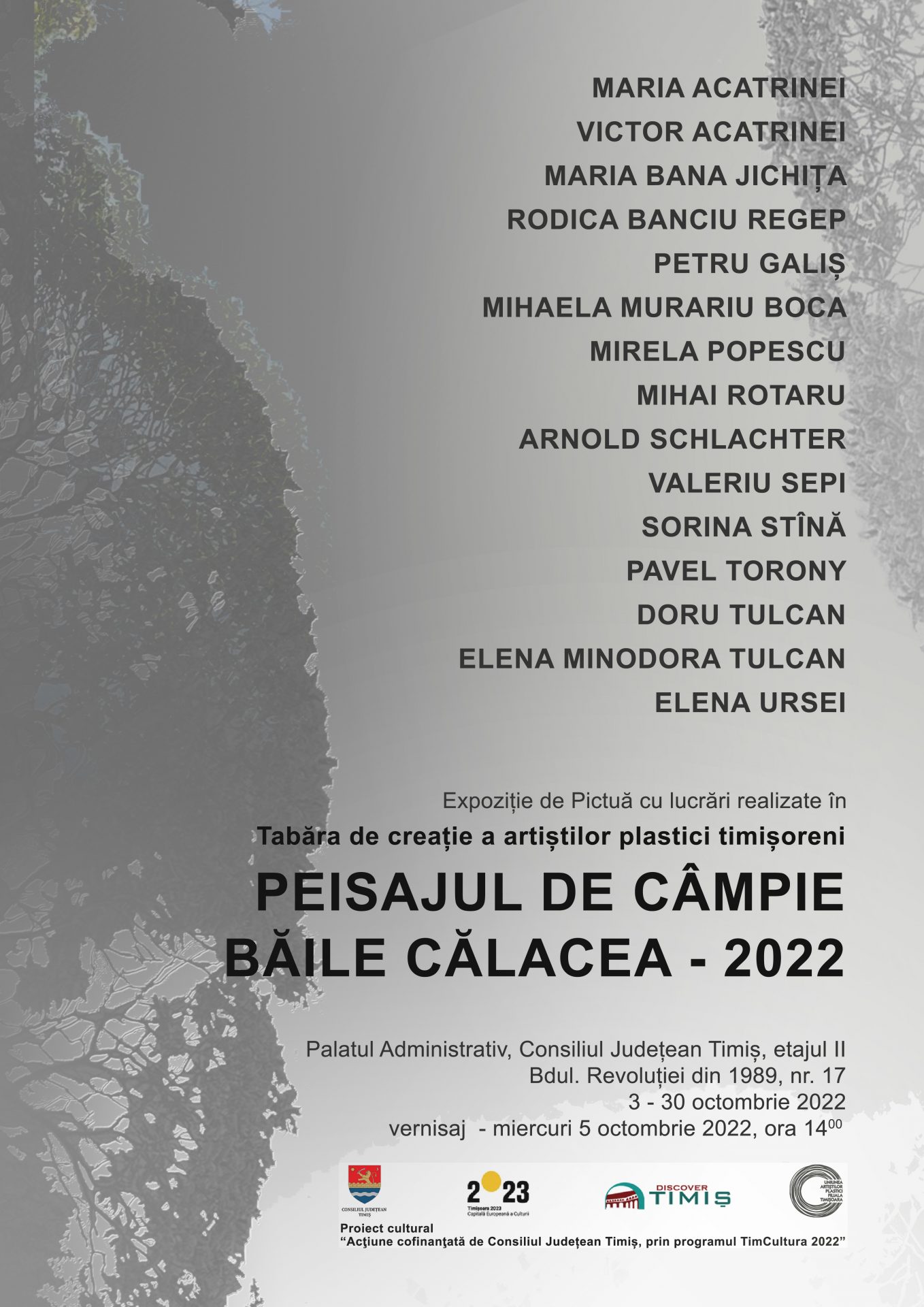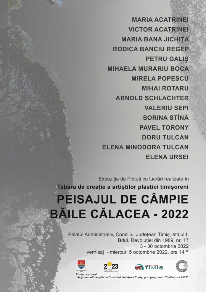 „TABĂRA DE CREAȚIE A ARTIȘTILOR PLASTICI TIMȘORENI PEISAJUL DE CÂMPIE BĂILE CALACEA”- 2022, desfasurată în perioada 21-31 august 2022, în localitatea Băile Calacea, se finalizează cu expoziția de pictură a artiștilor participanți în proiect, la Palatul Administrativ al Consiliului Județean Timiș.