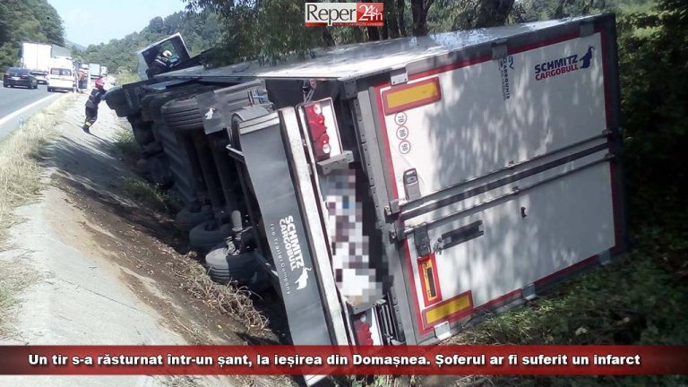 Un tir s-a răsturnat într-un șant, la ieșirea din Domașnea. Șoferul ar fi suferit un infarct!
