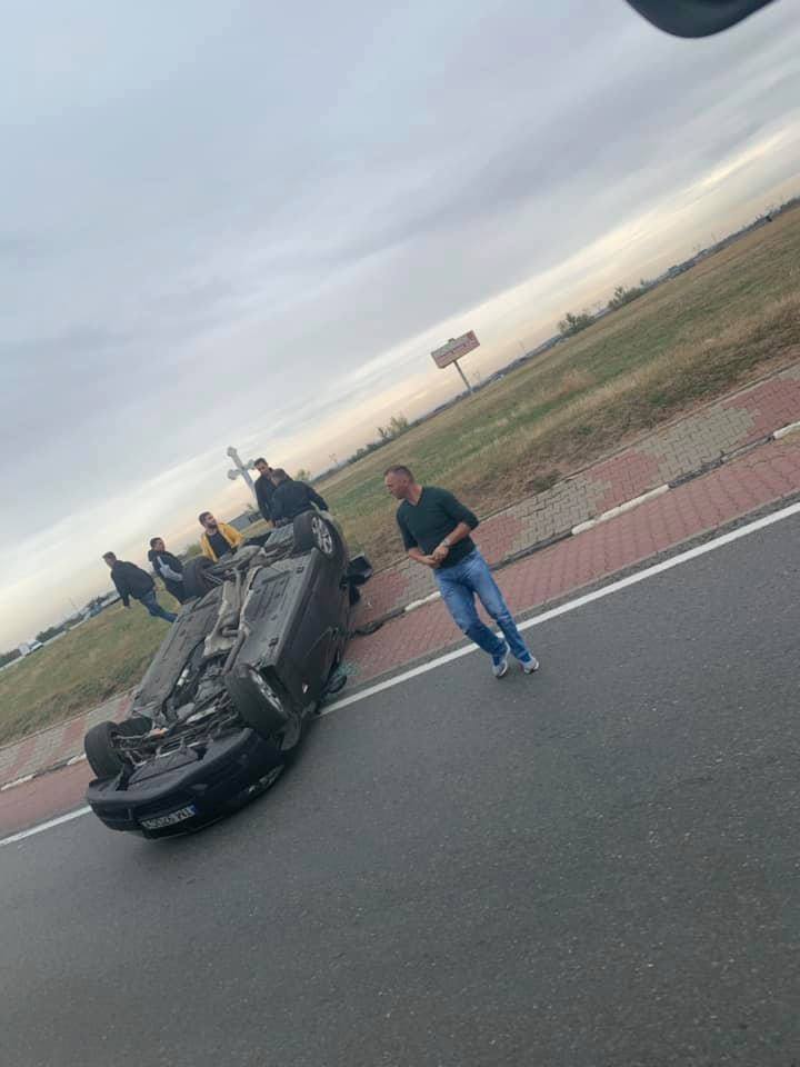 Mașină răsturnată pe DN69! Se circulă pe o bandă