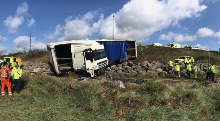Grav accident în Arad. Un autobuz cu 60 de muncitori a fost lovit de un tir