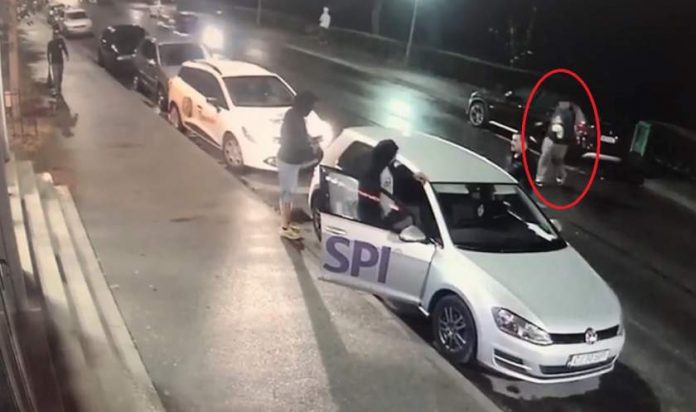 În înregistrare se vede cum bărbatul aruncă ceva la coşul de gunoi, după care se pregăteşte să traverseze strada. Stă câteva secunde şi pare că se asigură, pentru că se uită în direcţia din care se apropia o maşină.