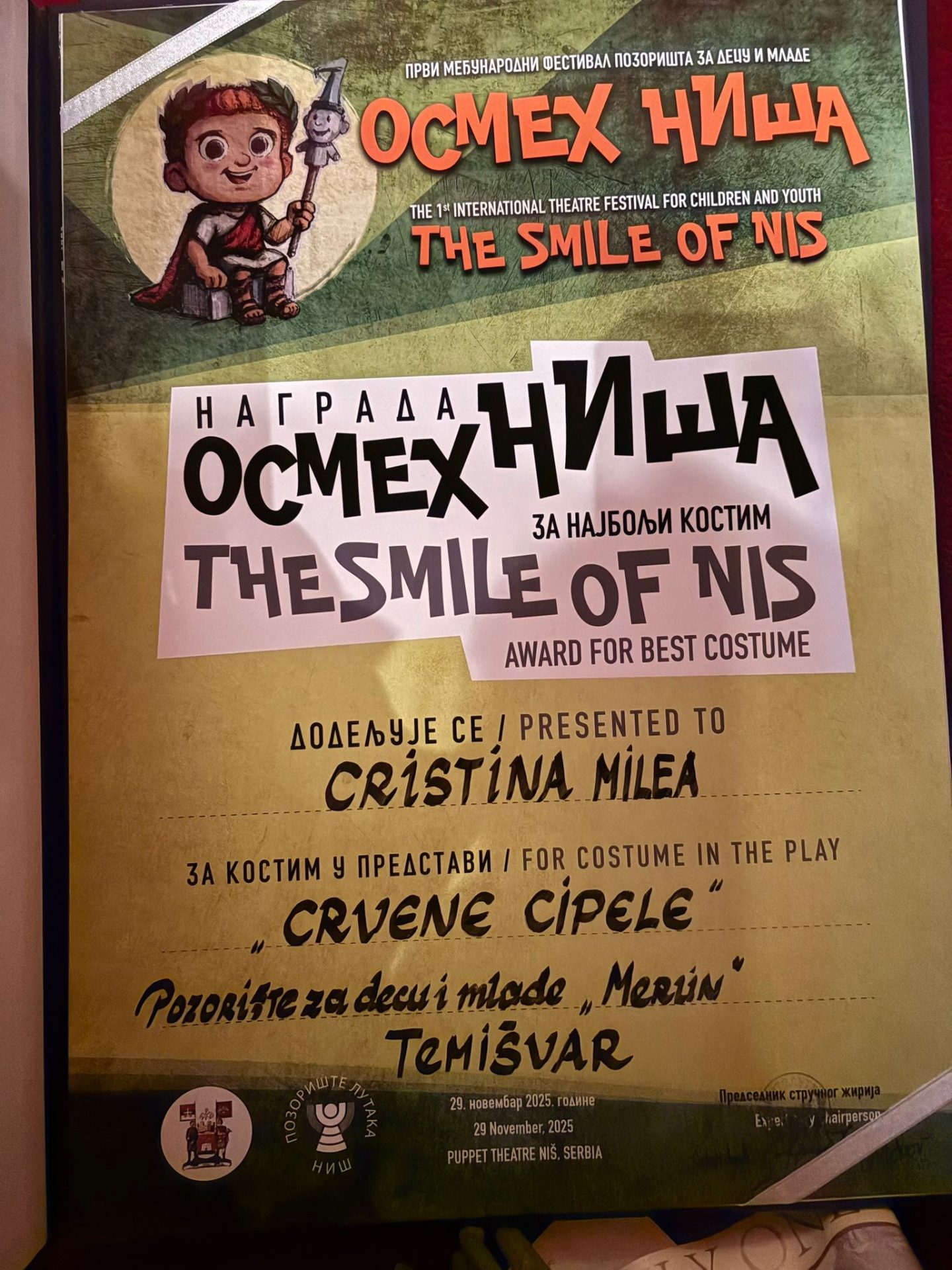 Teatrul pentru Copii și Tineret „Merlin” din Timișoara a participat, între 24 și 29 noiembrie 2025, la prima ediție a Festivalului Internațional de Teatru pentru Copii și Tineret „Osmeh Niša”, desfășurat la Niš, Serbia, cu spectacolul „Pantofii roșii”, o producție complexă semnată de o echipă artistică valoroasă și distinsă în repetate rânduri la festivaluri din țară și din străinătate.
