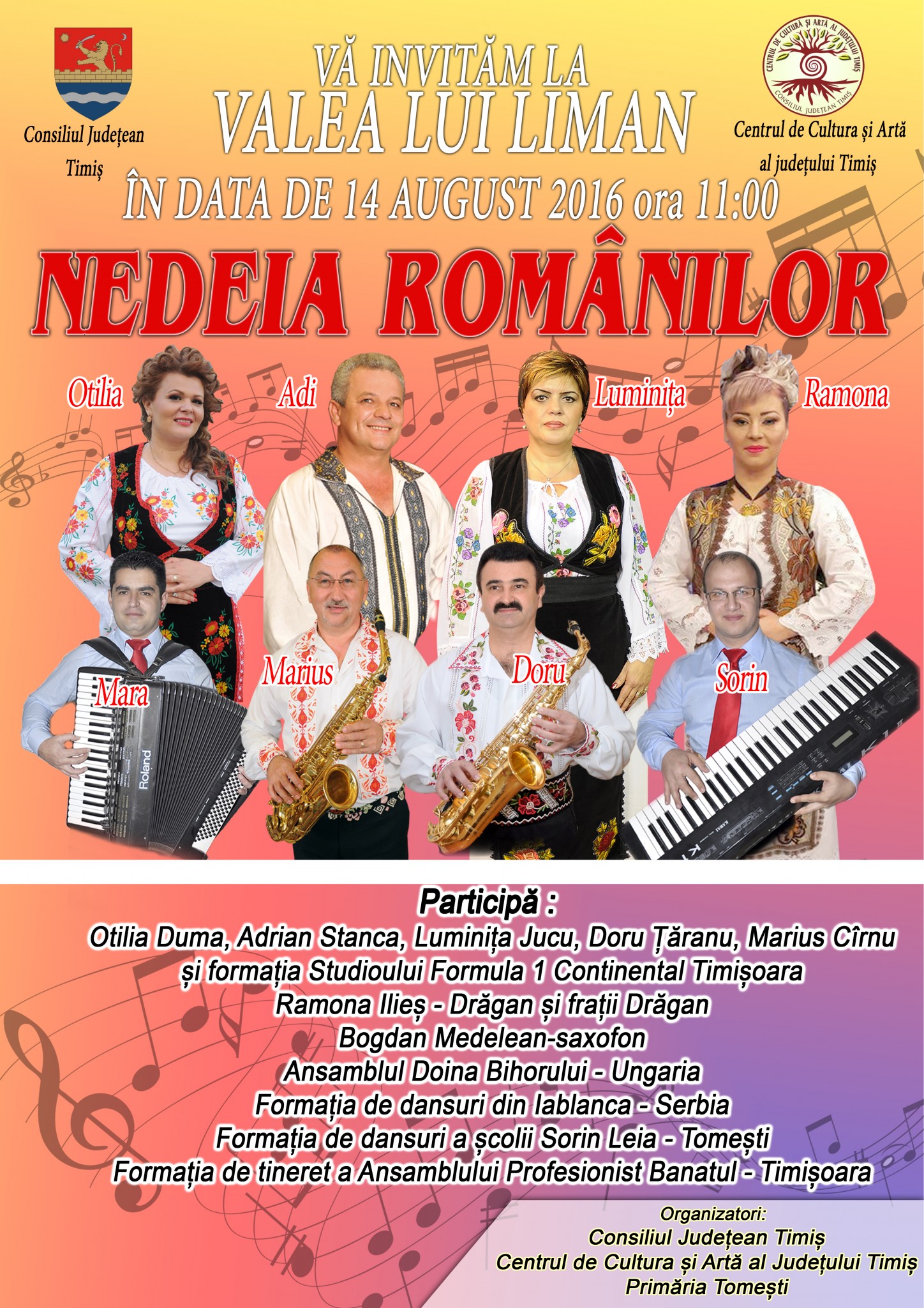 Consiliul Județean Timiș, prin Centrul de Cultură şi Artă Timiş, în colaborare cu Primăria comunei Tomeşti, organizează o nouă ediţie a manifestării tradiţionale „NEDEEA ROMÂNILOR”, eveniment finanţat de Consiliul Judeţean Timiş și care se va derula duminică, 14 august, la Valea lui Liman din judeţul Timiş, începând cu ora 11.
