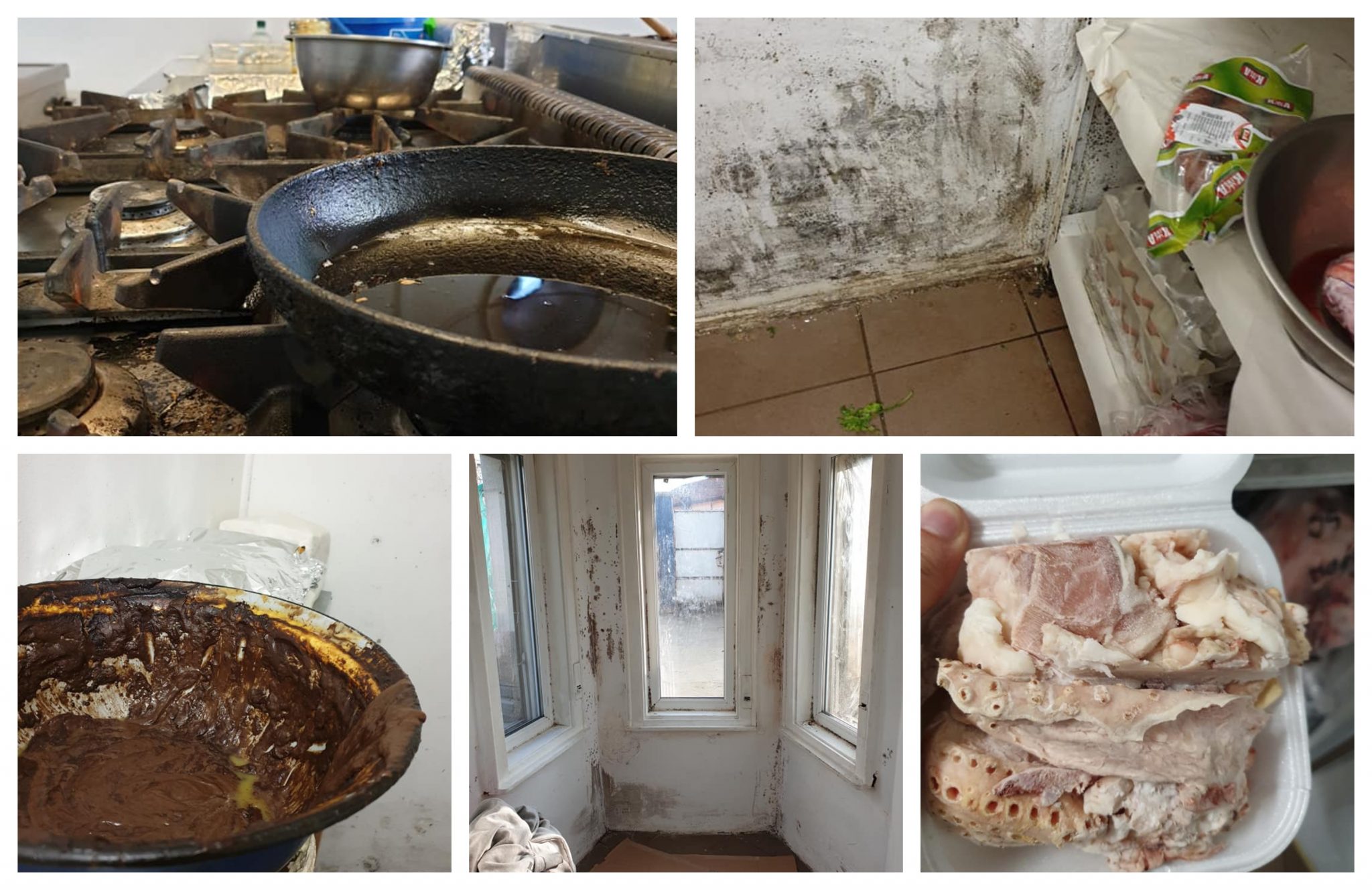 În imagini se văd oale și tigăi pline de rugină și mizerie, carne și ouă păstrate în condiții impropriii, pereți scorojiți și plite murdare.