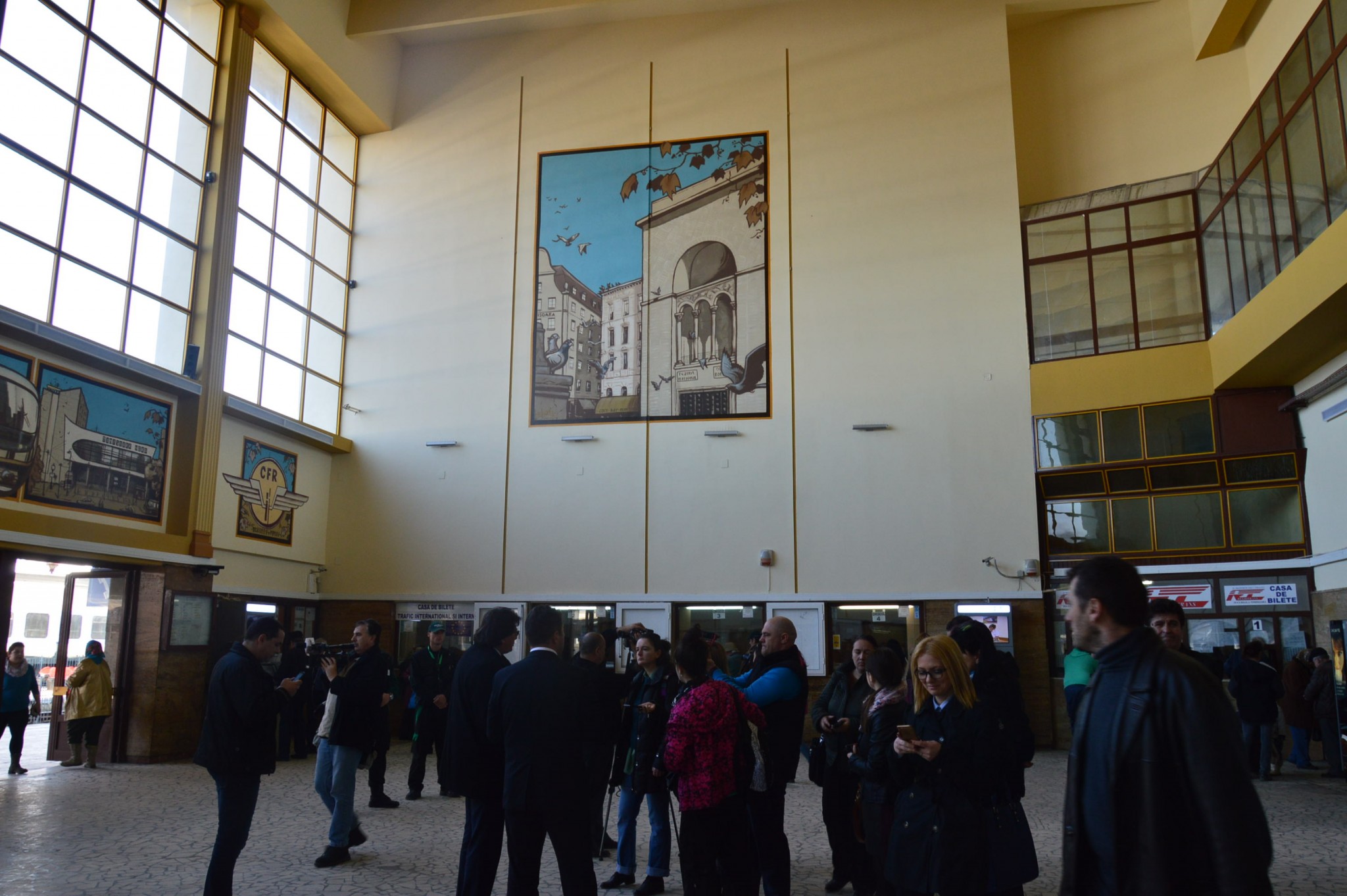 De la stânga la dreapta: gara iosefinică primind o garnitură cu aburi, legată de un tren — aflu din presă — „Imperio”, ultimul răcnet în materie de material rulant autohton, trecând prin Gara de Nord a viitorului — mă gândeam, dar nu, nu există machete, schițe, se pare că nu există nimic în calculatoarele arhitecților, care să-l fi inspirat pe artistul mural! —, de fapt, a prezentului, cu fațada de azi, zugrăvită, ca în anul de grație 1976. Așadar, slabe speranțe! — ne transmit din toți porumbeii, neopriți de țepile (țepele?!) CFR, pereții gării din Timișoara. Și multă atenție, să nu călcăm pe umbra Lupoicei, după ce se va schimba pardoseala!, dacă tot ne credem pe Corso, cu fața la „Eminescu” și spatele la un magazin ieftin, cu „de toate” — cum sunt tot mai multe pe Centru, printre fast-food-urile deja tradiționale —, în locul unor buticuri de lux, normale la „kilometrul zero” al unui „oraș de cinci stele”.