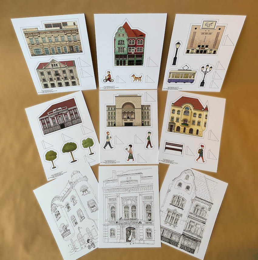 Timișoara de colorat cuprinde 7 cărți poștale în format A5, cu clădirile istorice: Palatul Salamon Brück, Primăria Veche, Fosta Casă “La Leu”, Clădirea Operei, Cinema Studio, Casa cu Flori și Fosta Bancă de Scont. Pe verso este trecută povestea fiecărei clădiri, completând caracterul educativ al produsului, destinat copiilor de toate vârstele.
