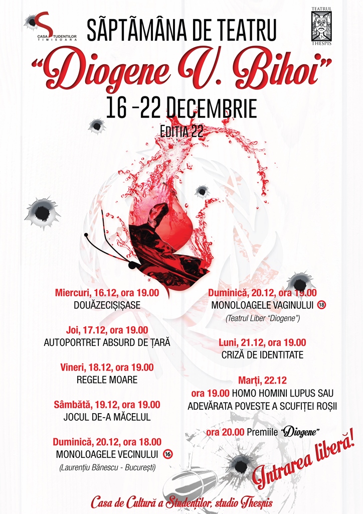 Începe a 22-a ediţie a festivalului „Săptămâna de teatru Diogene V. Bihoi”. Manifestarea, organizată de Teatrul Studenţesc Thespis al Casei de Cultură a Studenţilor din Timişoara, are loc între 16 şi 22 decembrie.