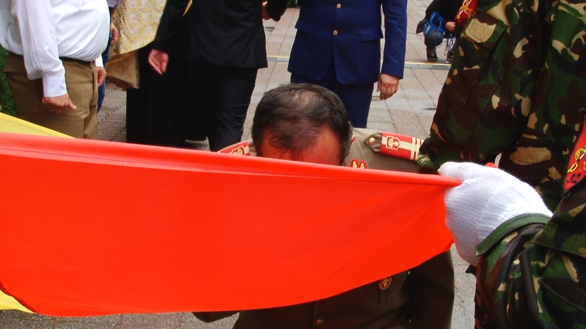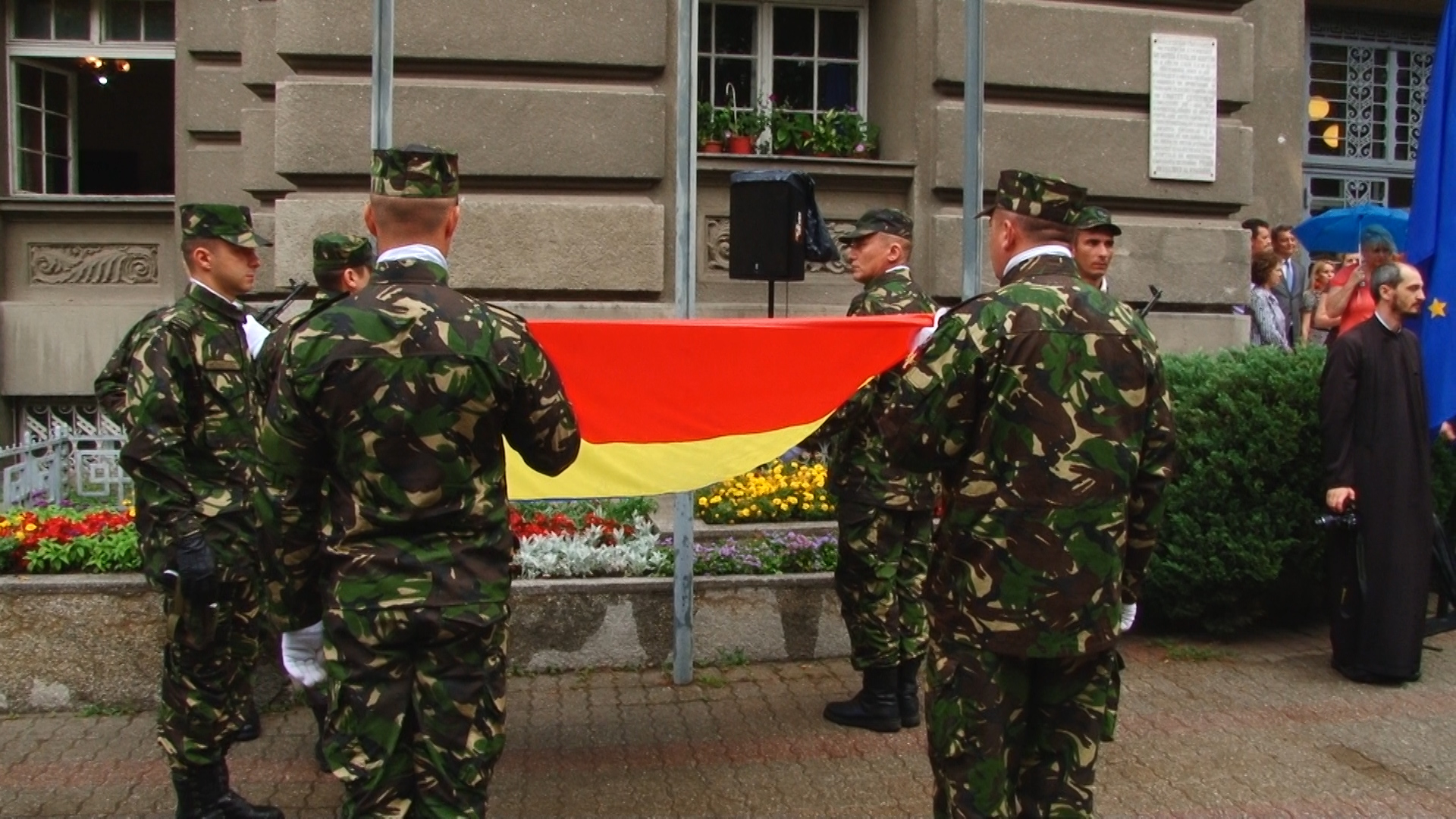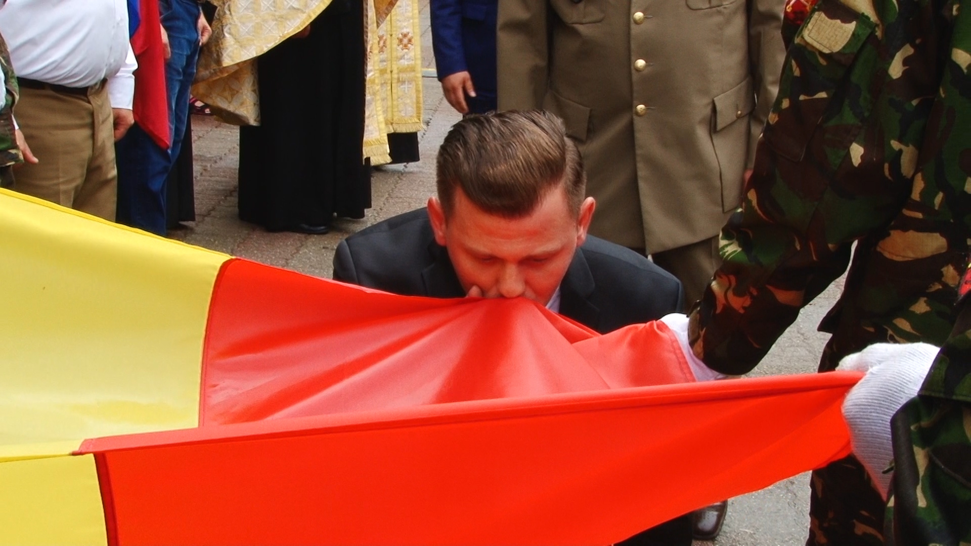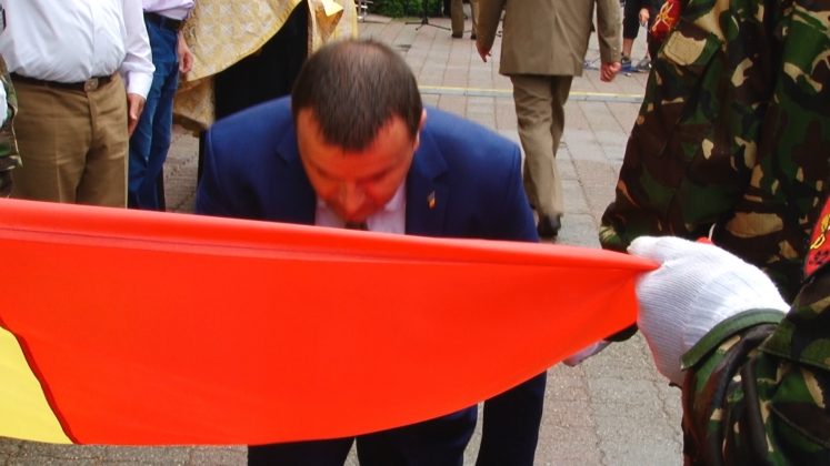 Deși la eveniment au venit puțini timișoreni, cel mai probabil, din cauza ploii torențiale, Ziua Drapelului a fost celebrată de reprezentanții de seamă ai județului. Unul dintre aceștia a fost subprefectul Daniel Cristian Franţescu, care după ce a trecut în revistă garda de onoare, a îngenuncheat şi a sărutat drapelul.