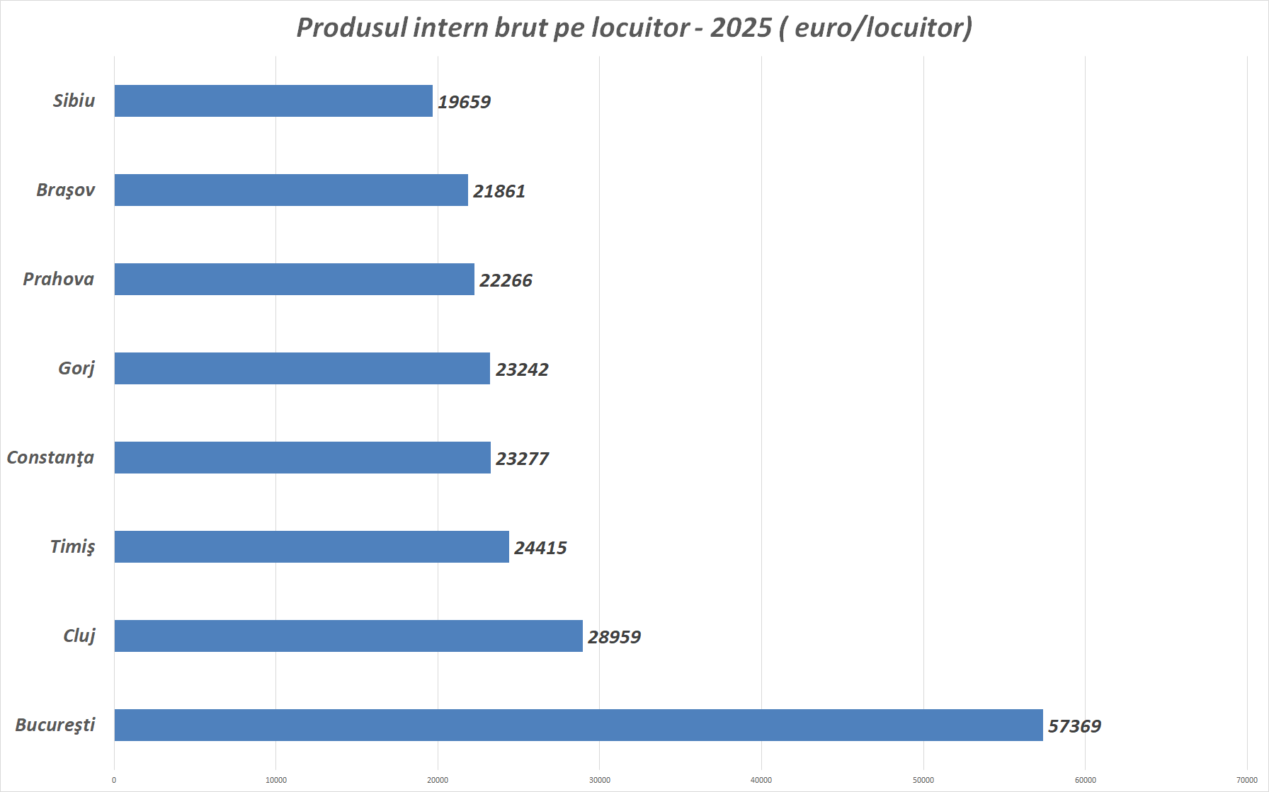 ► Sibiu: 19.659 → 21.251 euro. Creștere anuală: +8,1%. Unul dintre cele mai industrializate județe din România.