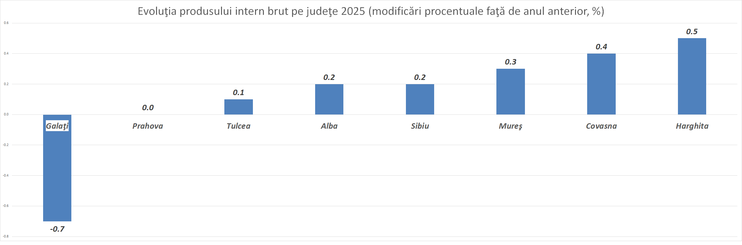 Județul Galați ar urma să încheie 2025 al doilea an de contracție economică (-0,7%), după ce și 2024 a avut o scădere de 0,9%, potrivit calculelor Comisiei Naționale de Prognoză.