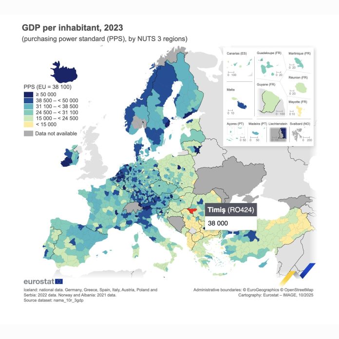 Impactul economic al Timișoarei se reflectă la nivel regional. Conform datelor Eurostat: județul Timiș a ajuns la 99,74% din media Uniunii Europene la PIB/locuitor, raportat la Puterea de Cumpărare (PPS), cu o valoare de aproximativ 38.000 PPS, foarte aproape de media UE de 38.100 PPS*. Această poziționare confirmă faptul că dezvoltarea orașului generează efecte structurale, măsurabile, dincolo de granițele sale administrative.