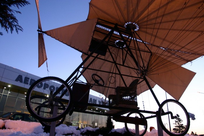Macheta aeroplanului Vuia 1 realizată la scară 1:1 cu care bănăţeanul a reuşit performanţa şi monumentul bust al acestuia sunt amplasate în faţa aerogării.