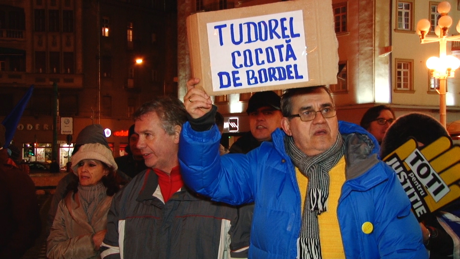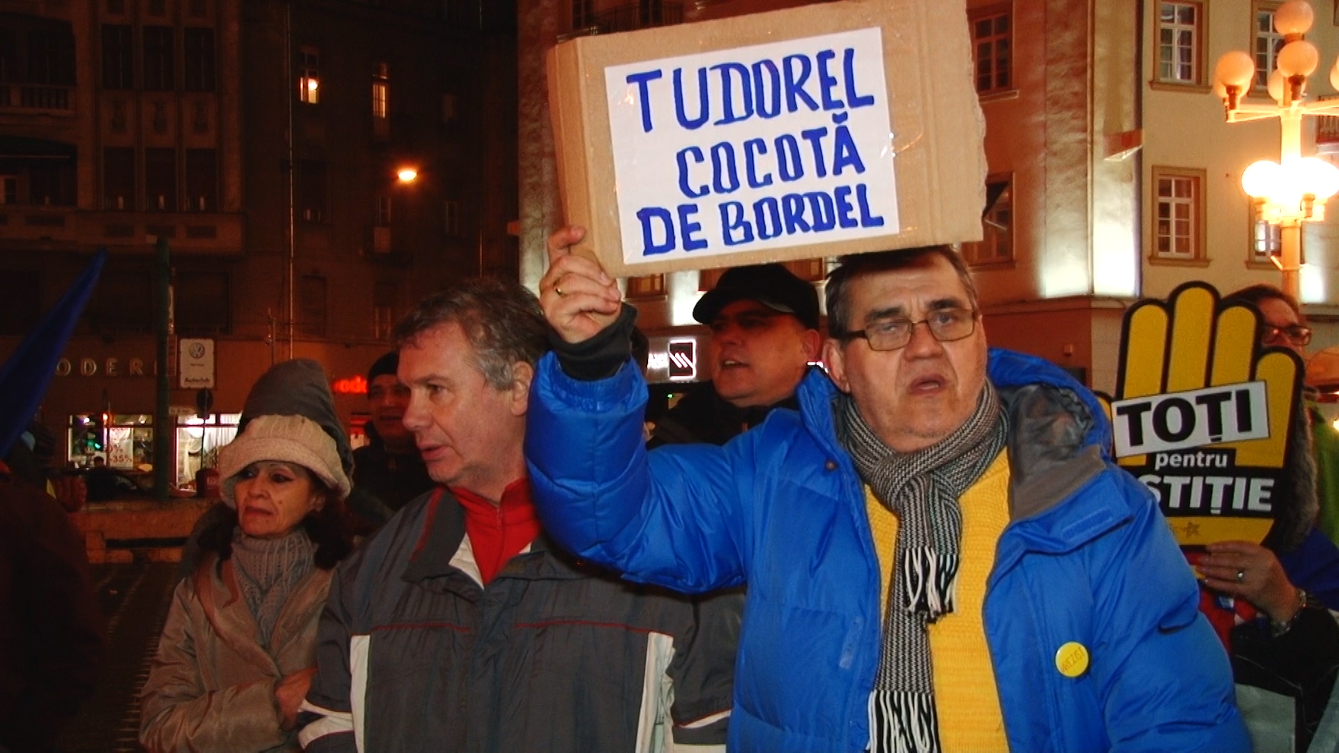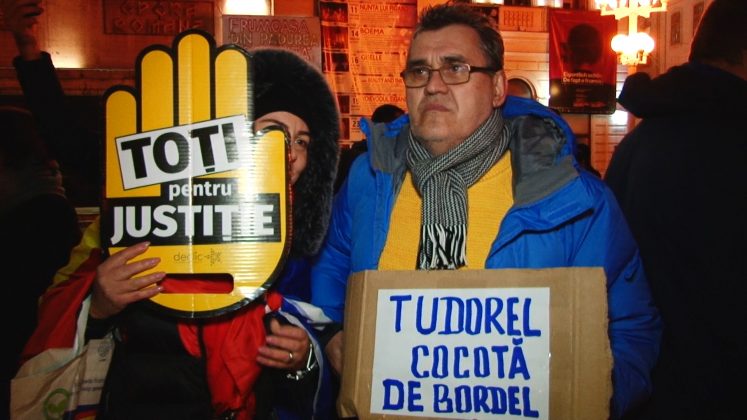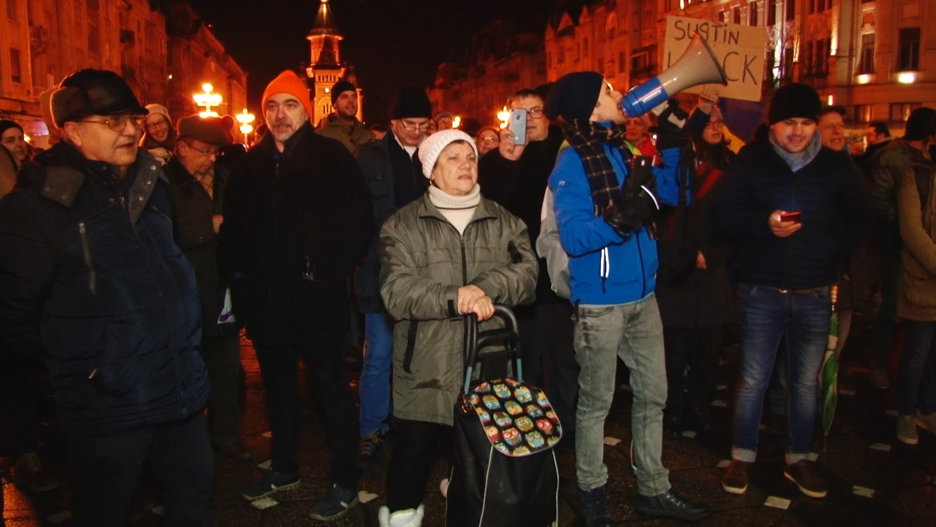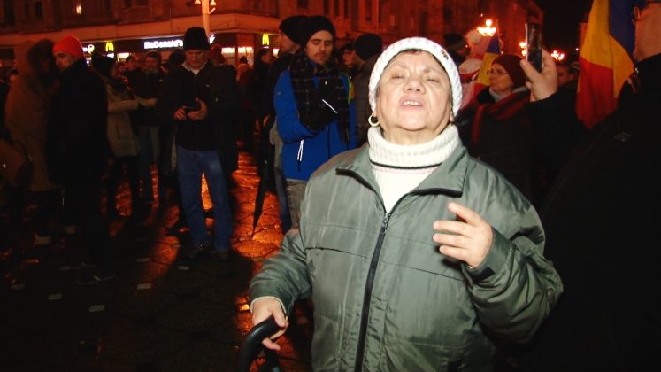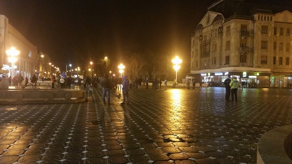 Update 20.30: În Piața Victoriei sunt acum peste 100 de protestatari. Aceștia scandează lozinci precum „Nu vrem sa fim conduși de hoți! „si „Demisia!”. Timișorenii spun ca nu protestează pentru o persoană, ci pentru că este atacat întreg sistemul judiciar.