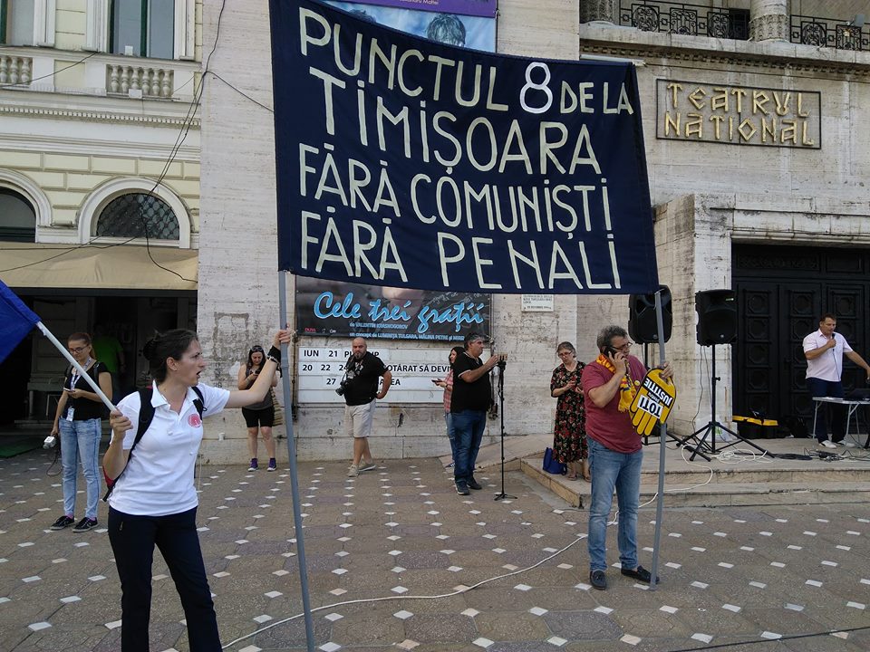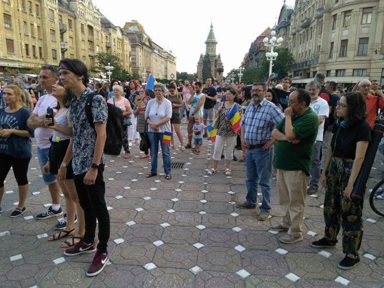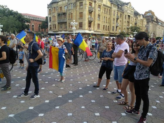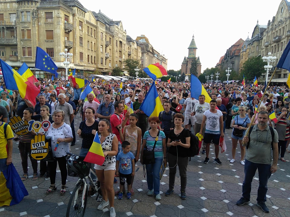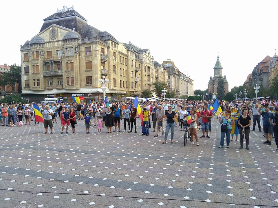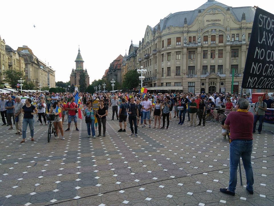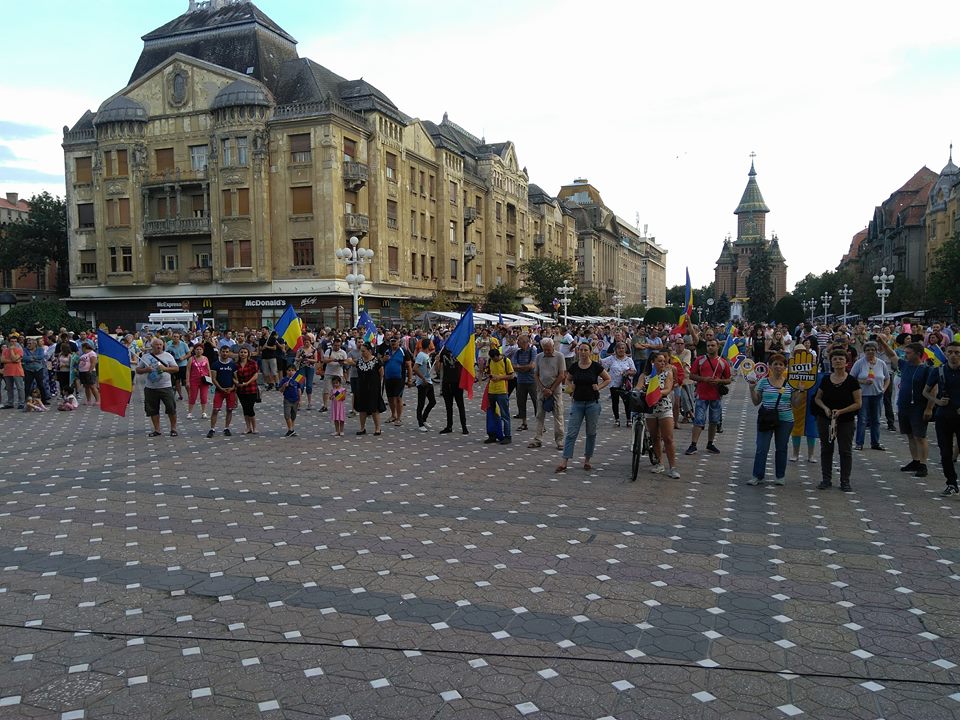 Update 1: În Piața Victoriei s-au adunat aproximativ 1.000 de timișoreni. Aceștia continuă să scandeze lozinci împotriva corupției și „DNA să vină să vă ia!” Protestarii vor pleca în marș spre Palatul Dicasterial, sediul instanțelor de judecată din Timiș.