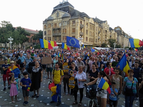 Oamenii flutură steaguri tricolore și pe cele ale Uniunii Europene. Se scandează lozinci împotriva lui Liviu Dragnea și pro democrație.