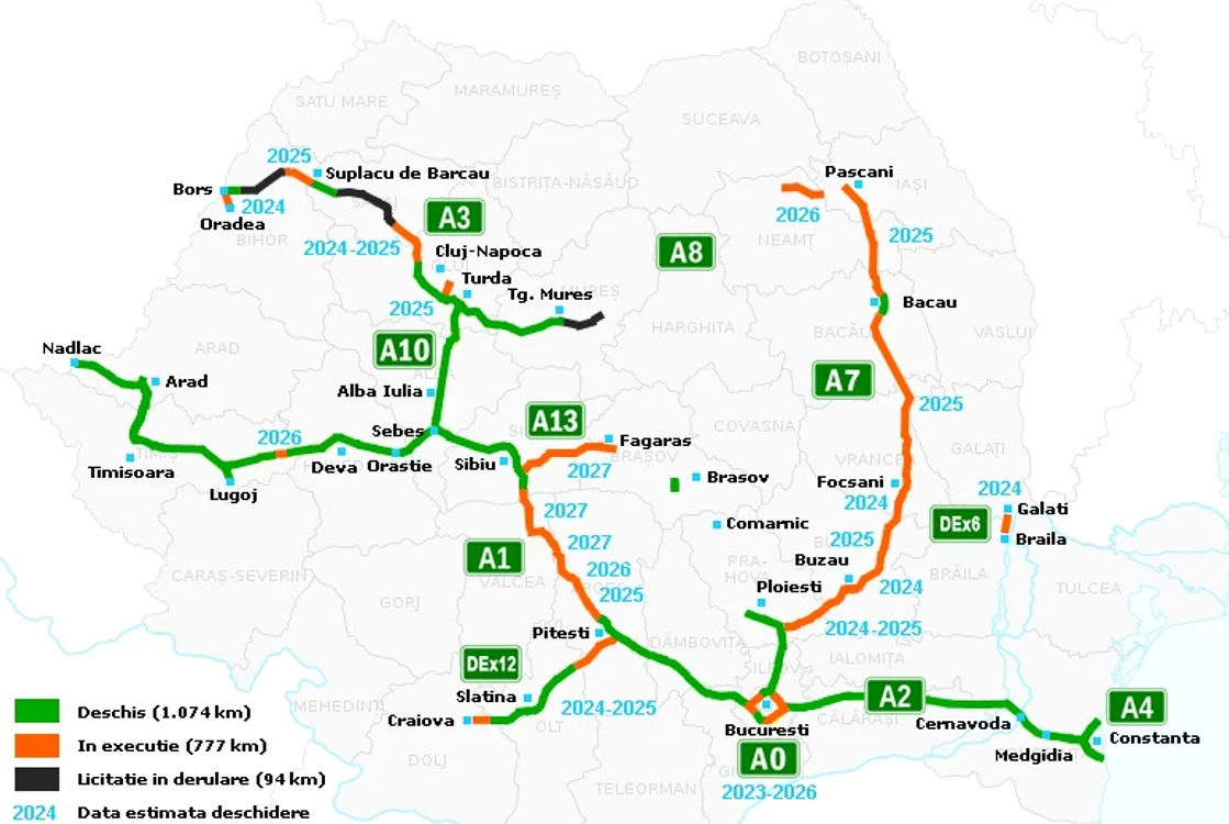 În acest moment, România a depășit pragul de 1.000 de kilometri de autostradă, după ce autoritățile au mai dat în folosință 15 kilometri (lotul Chețani-Câmpia Turzii al Autostrăzii Transilvania A3) la finalul anului 2023.