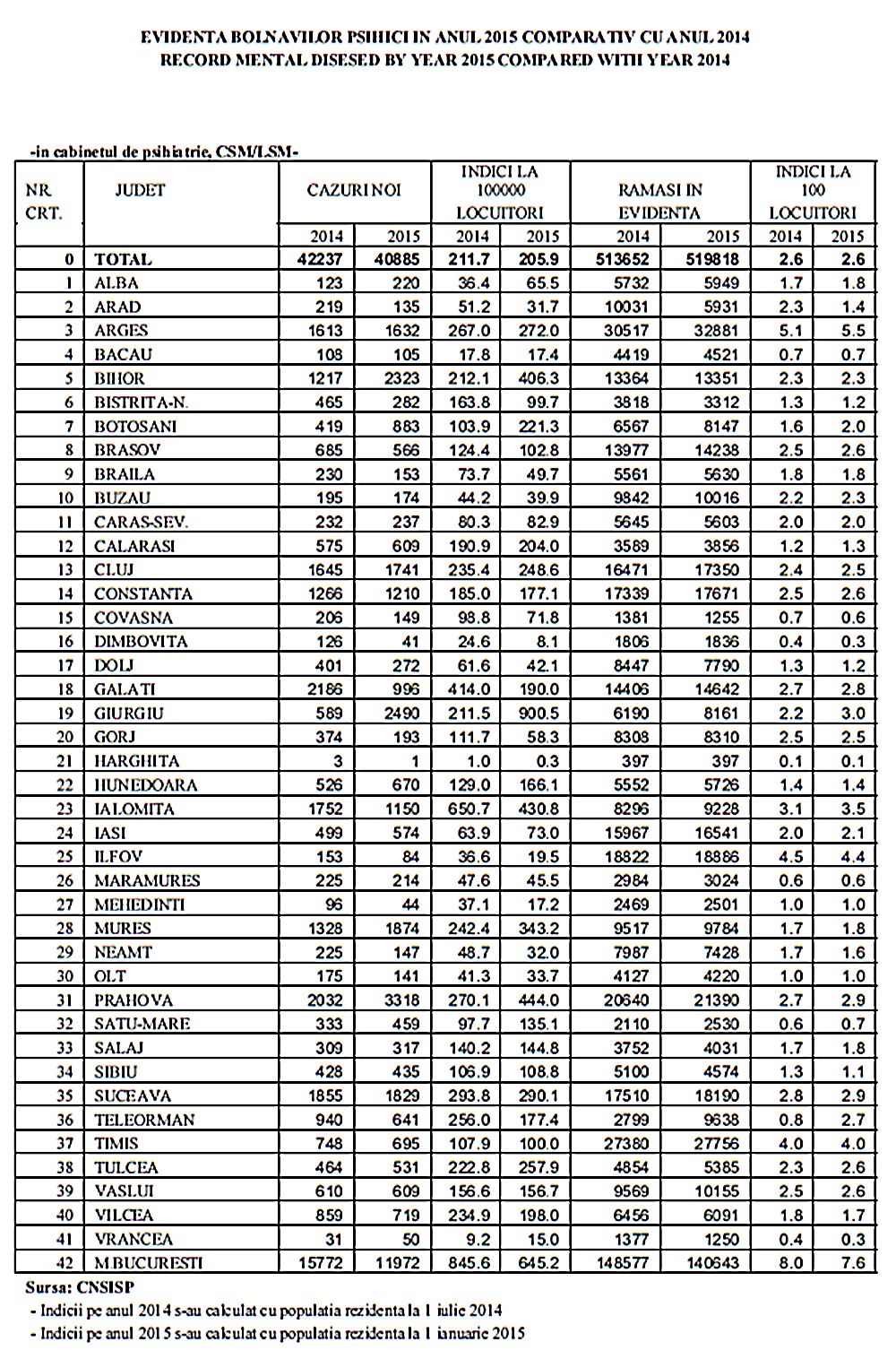Cu un an înainte, în 2014, au fost 513.652 de bolnavi psihici rămași în evidență, indicele la suta de locuitori fiind cam același – 2,6 %.