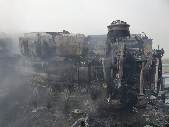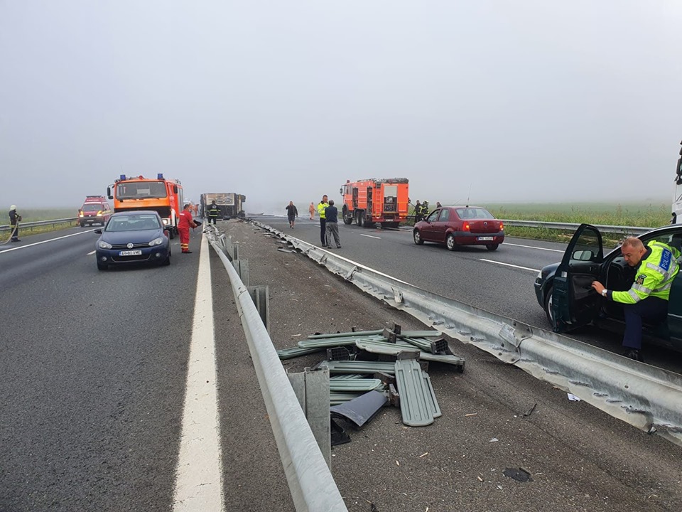 Incendiul a izbucnit la aproximativ trei kilometri de punctul de trecere Nădlac 1. Camionul s-a și răsturnat. Acesta transporta piese auto. Conform Infotrafic, autotrenul a acroșat două tiruri staționate pe banda de urgență, s-a răsturnat peste glisiera mediană, după care a luat foc.
