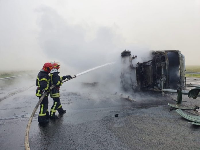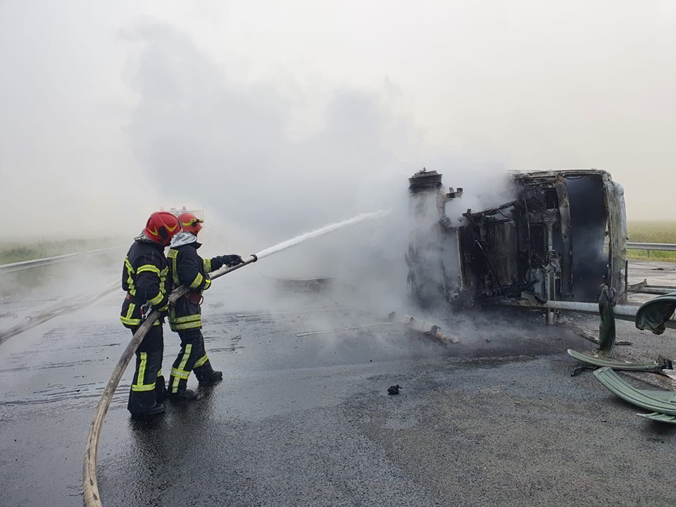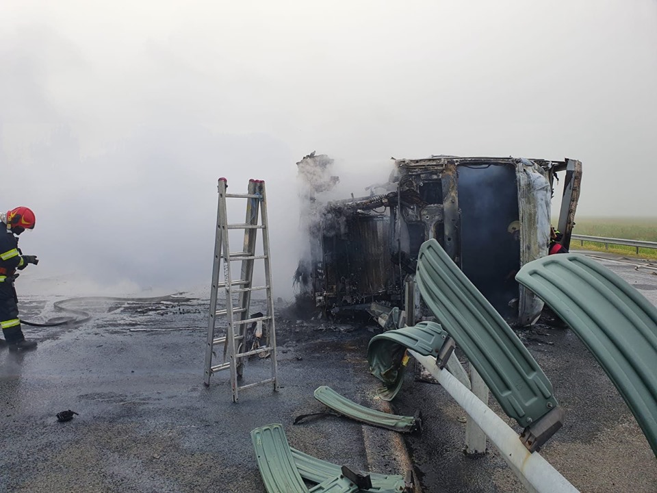 Un TIR a luat foc, luni dimineața, pe autostrada A1, în drum spre vama cu Ungaria. Pompierii au intervenit de urgență. Șoferul a reușit să iasă teafăr din cabină.
