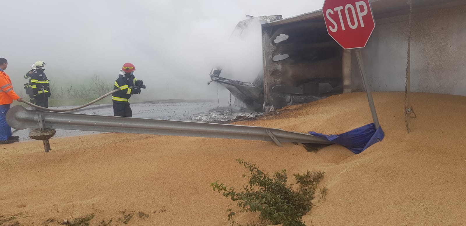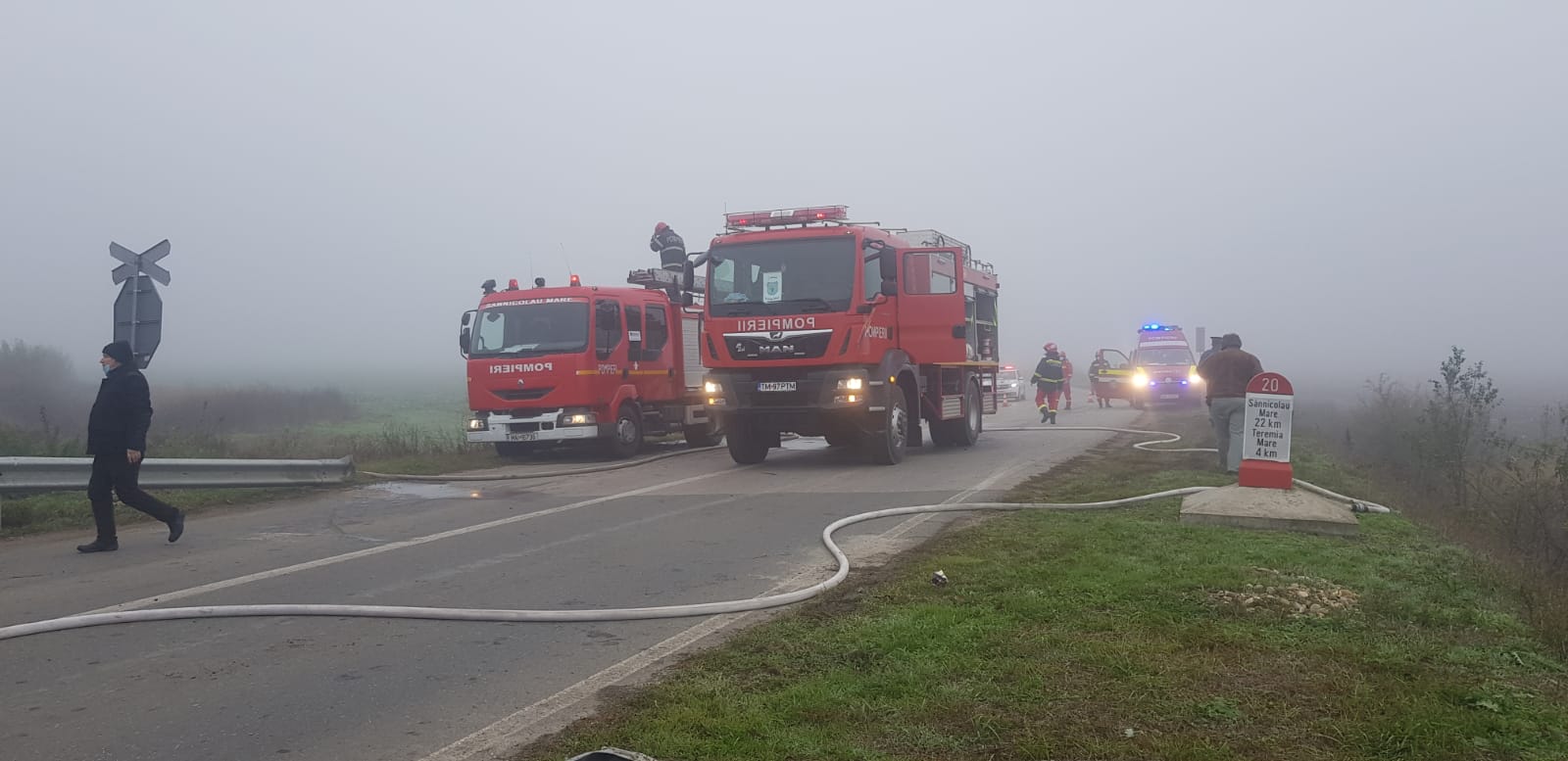 În urma impactului, cabina autotrenului, care transporta cereale, a luat foc. Cele 4 persoane implicate în accident s-au autoevacuat și nu necesită îngrijiri medicale.