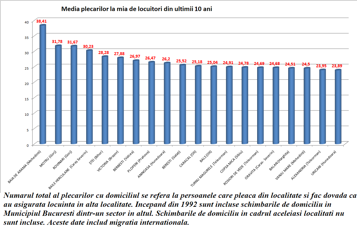 Anul trecut, bariera celor 400.000 de plecări a fost depășită. Institutul Național de Statistică numără plecările cu domiciliul ca fiind ”persoanele care pleaca din localitate si fac dovada ca au asigurată locuinta in alta localitate. Incepand din 1992 sunt incluse schimbarile de domiciliu in Municipiul Bucuresti dintr-un sector in altul. Schimbarile de domiciliu in cadrul aceleiasi localitati nu sunt incluse”. Datele de mai jos includ migratia internațională. Datele arată că rata cea mai mare a plecărilor este din Baia de Aramă (Mehedinți), Motru (Gorj) și Rovinari (Gorj).