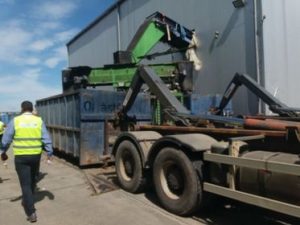 6. La staţia de sortare a deşeurilor uscate ajunge şi descarcă un camion care transportă acest tip de deşeuri. Zona de recepţie este compusă dintr-o zonă tampon de aproximativ 500 mc, de unde sunt preluate şi puse pe o bandă rulantă. Pe această bandă rulantă se realizează manual şi automatizat sortarea deşeurilor în următoarele subcategorii: