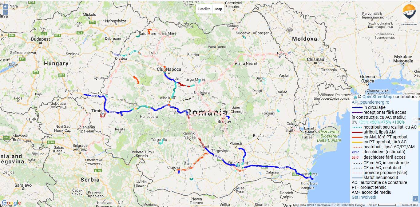 „Pe hartă puteți vedea, în amănunt, traseele autostrăzilor și centurilor rutiere, dar și segmentele de căi ferate aflate acum în diverse stadii de implementare. Puteți întelege mai bine care proiecte sunt blocate, care nu au autorizație de construire sau acord de mediu emis ori proiect tehnic aprobat”, transmite asociaţia.