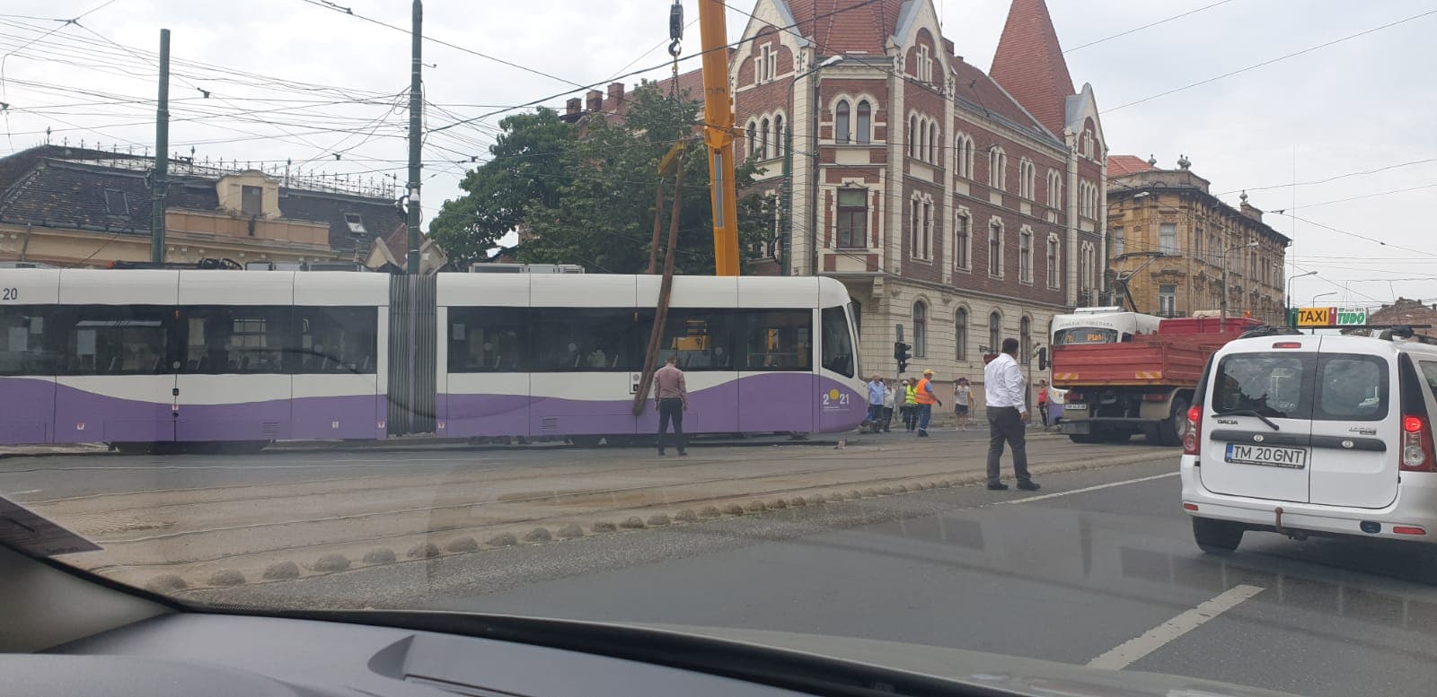 Un tramvai a deraiat în Piața Sfânta Maria din Timișoara. Angajații STPT intervin pentru a degaja garnitura de pe șine.