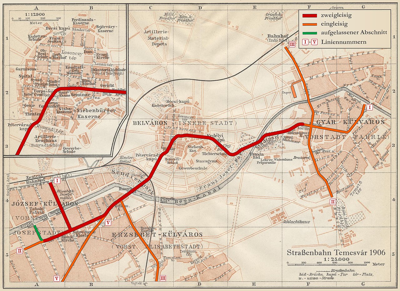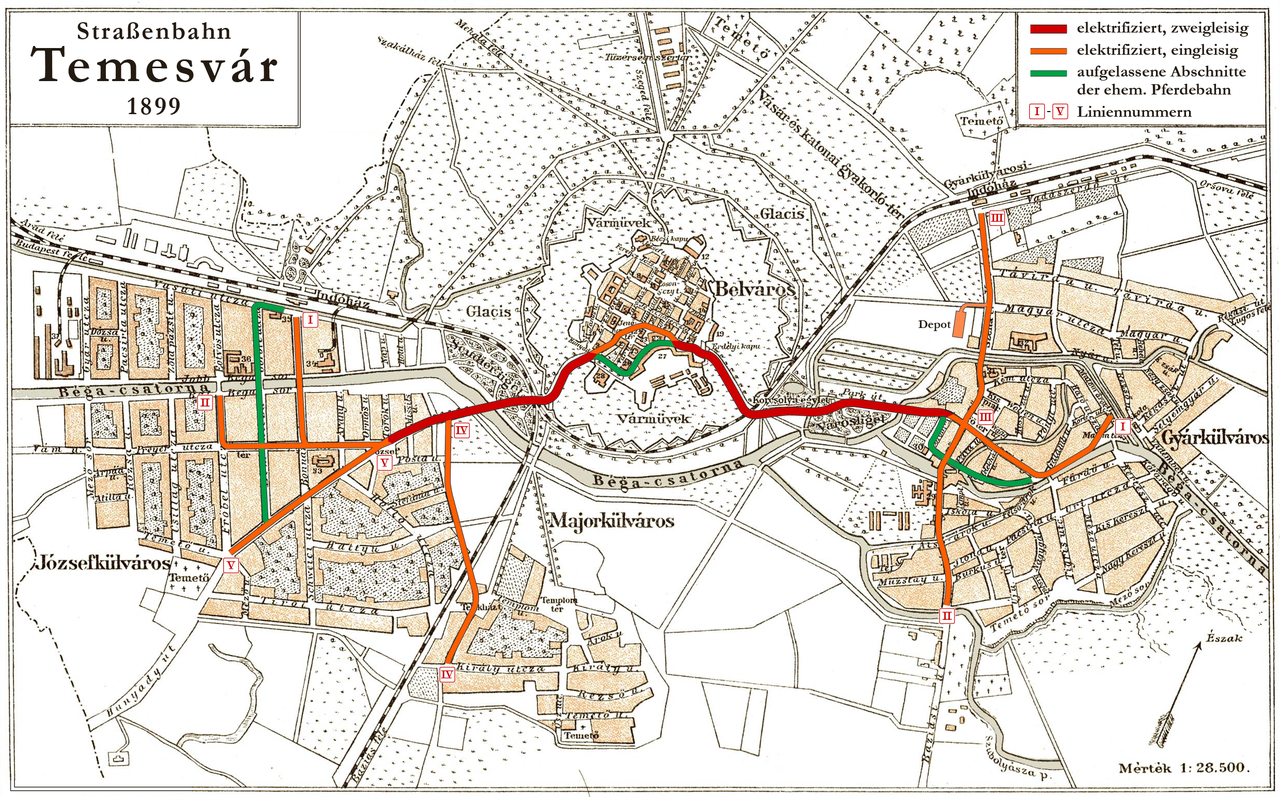 Primul test de conducere a avut loc pe 30 iunie 1899, înainte ca funcționarea electrică obișnuită să înceapă în sfârșit joi, 27 iulie 1899. Aceasta a marcat sfârșitul traficului de tramvaie trase de cai în Temesvár, în afară de un traseu nocturn către Gara de Nord și retur. Autobuzele trase de cai au încetat în sfârșit să mai funcționeze în acel moment. În același timp, rețeaua feroviară a crescut de la 6.636 sau 6.672 la 10.315 kilometri. În loc de cele două linii radiale de tramvai tras de cai și de linia suplimentară de autobuz trasă de cai (niciunul din acestea trei nu aveau numere) cinci linii acționate electric au circulat de acum înainte, inclusiv două linii circulare și trei linii radiale: