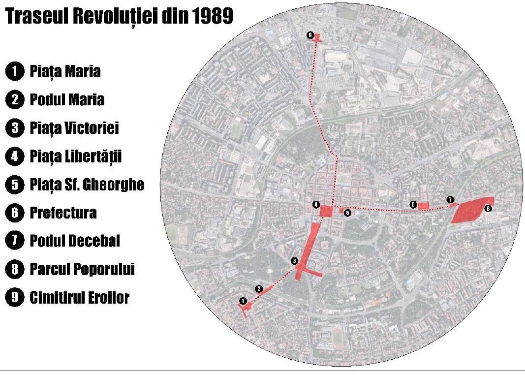 Acestea sunt: Piața Maria – Podul Maria – Piața Victoriei – Piața Libertății – Piața Sfântul Gherghe – Prefectura – Podul Decebal – Parcul Poporului – Cimitirul Eroilor. Traseul propus a creat deja unele nemulțumiri în rândul revoluționarilor. Rămâne de văzut care va fi proiectul final.