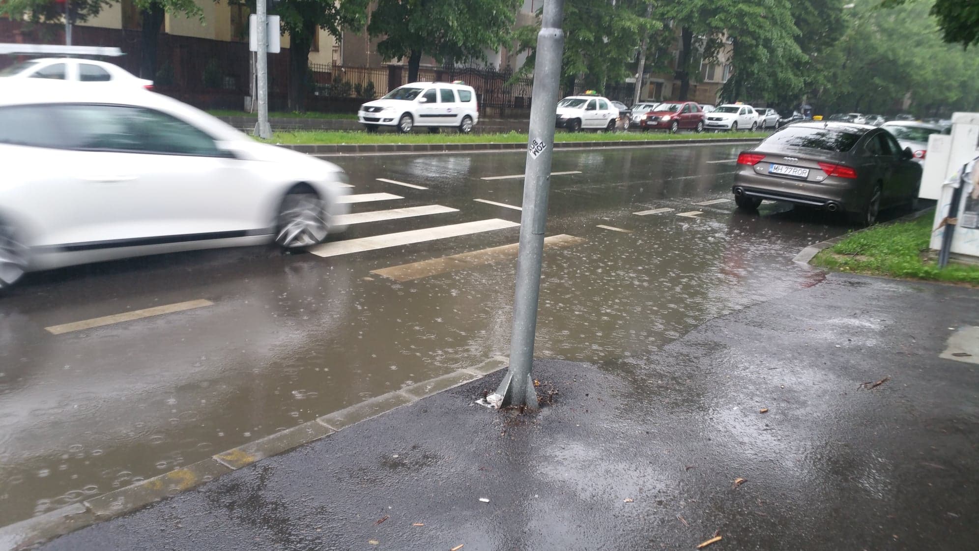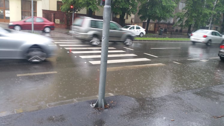 Nu exista macar o intersectie unde trecerile de pietoni sa fie fara balti ! Pietonii au dreptul sa treaca numai prin apa, daca au curaj.