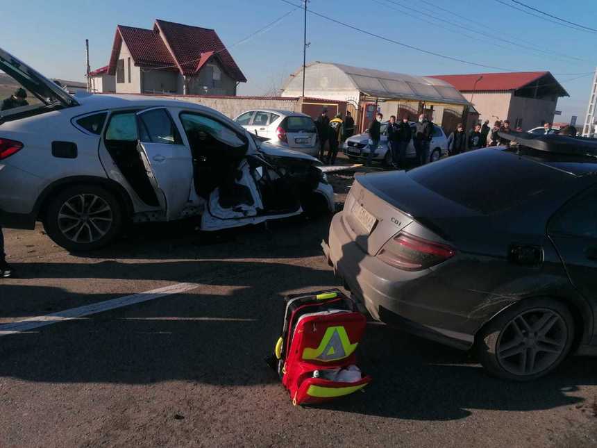 Alte două autovehicule, parcate în afara părţii carosabile, au fost avariate în urma coliziunii dintre cele care erau în mişcare.