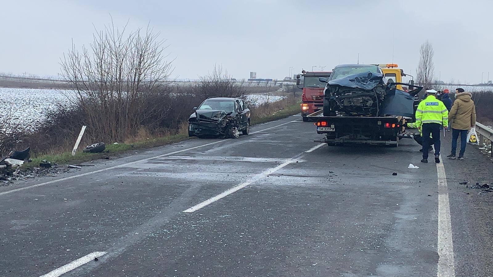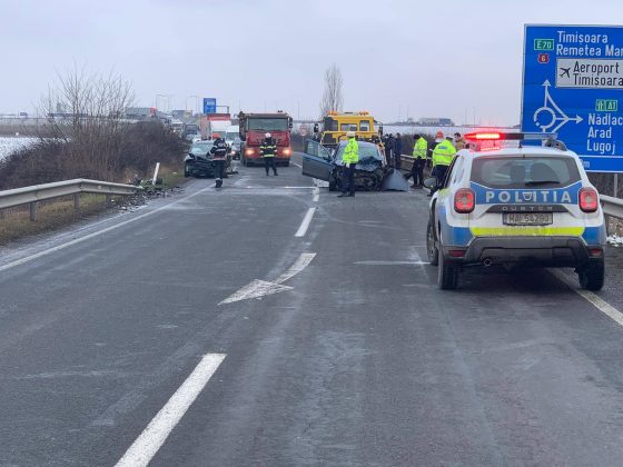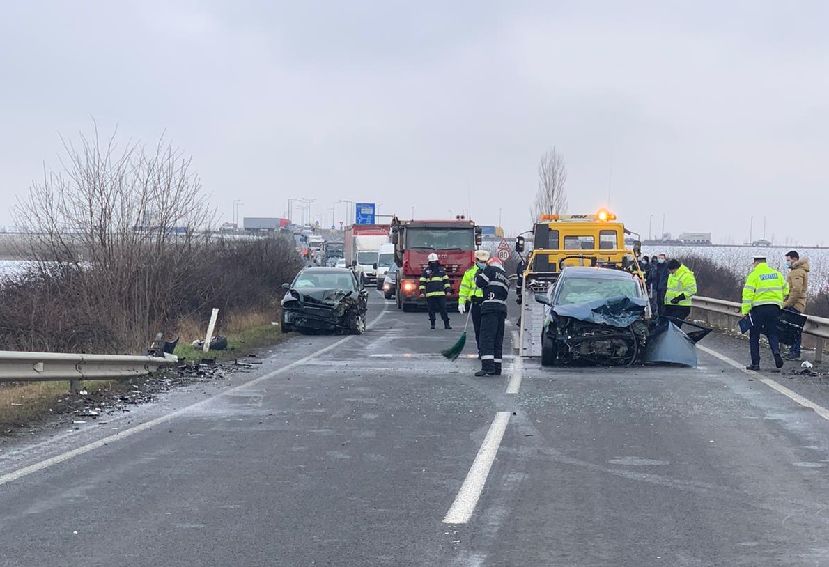 Trei persoane au fost rănite, luni după-masă, pe Drumul National 6, în apropiere de Timișoara, în urma unui accident rutier. Două mașini au fost implicate în coliziune.