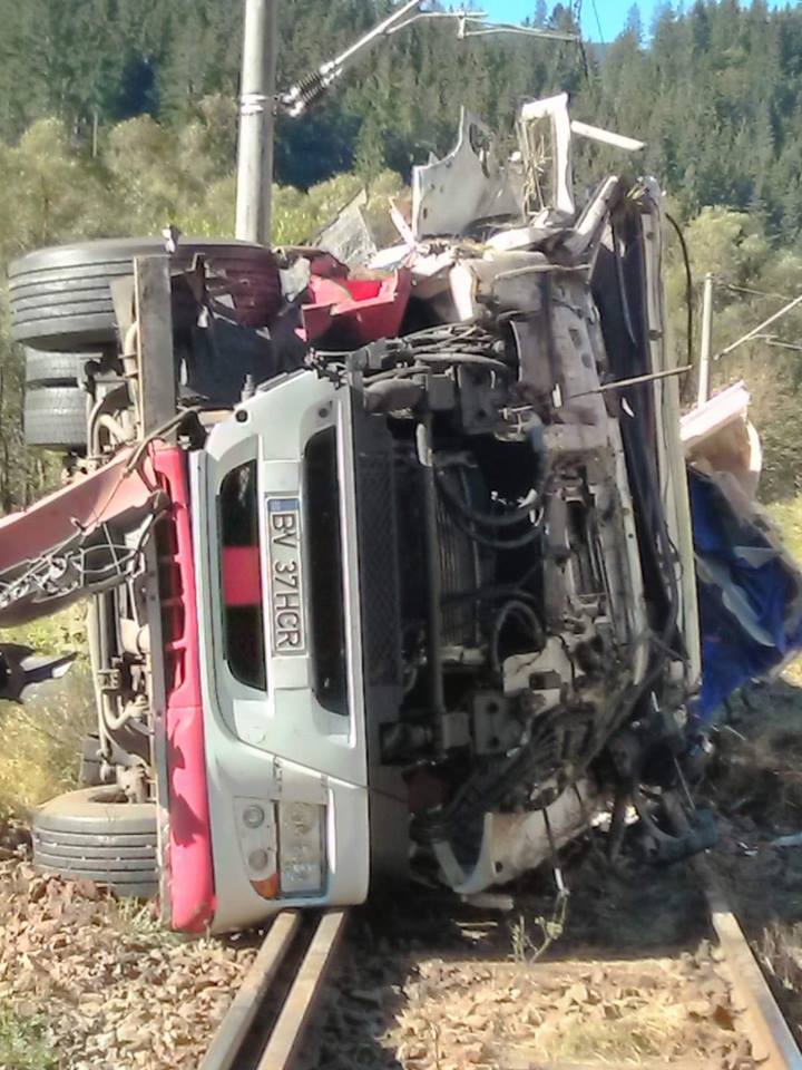 Autocisterna s-a răsturnat a trecut de parapete și a ajuns pe liniile de tren, blocând ciculația feroviară, între Iacobeni şi Argestru.