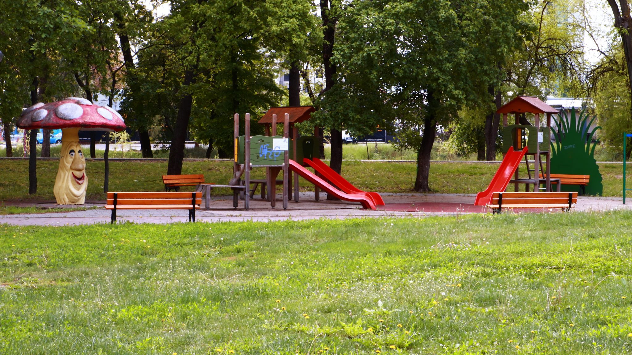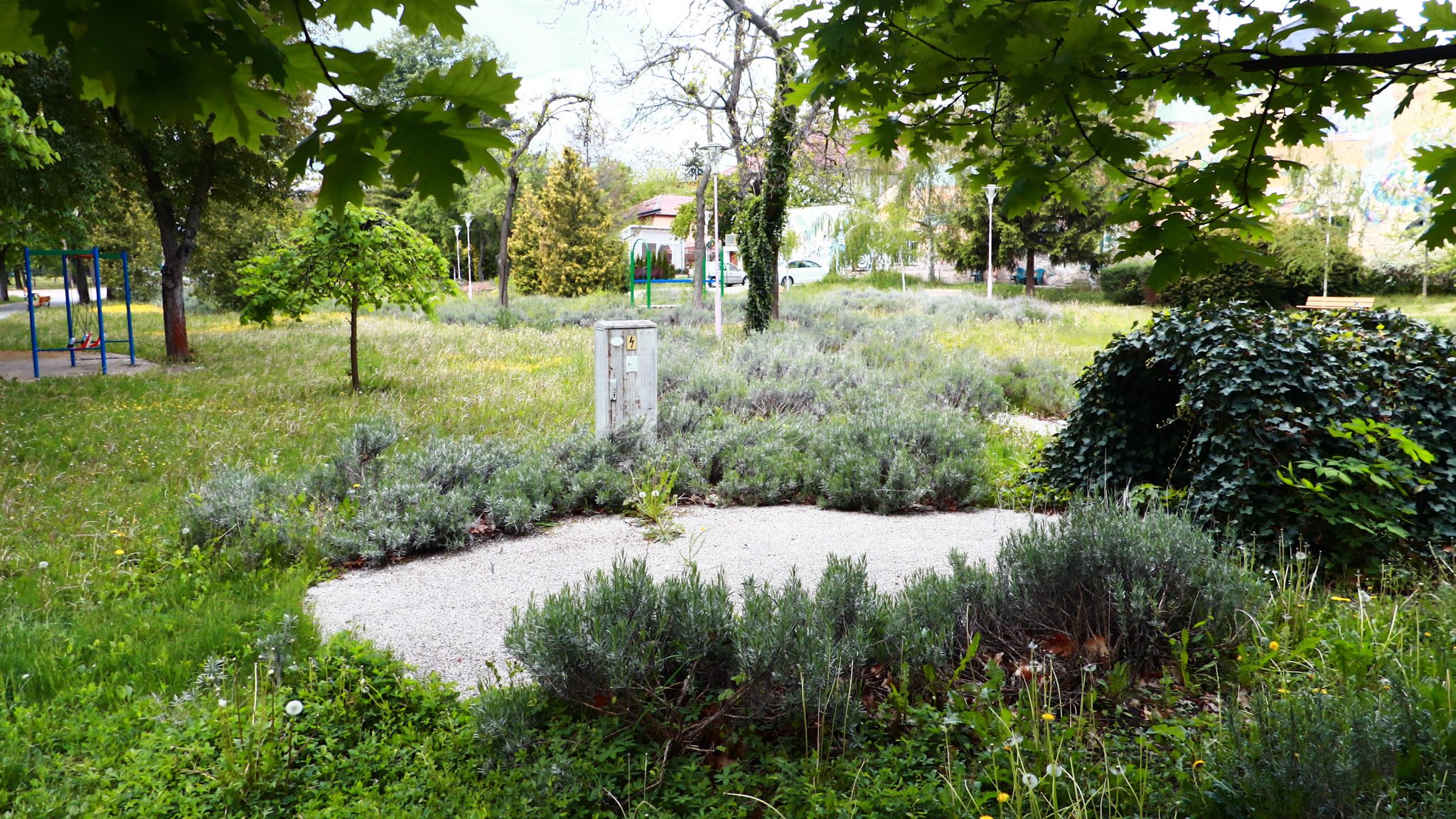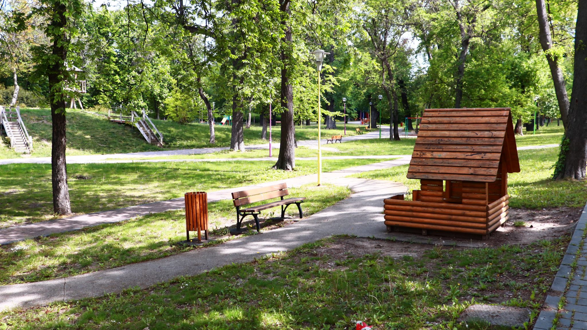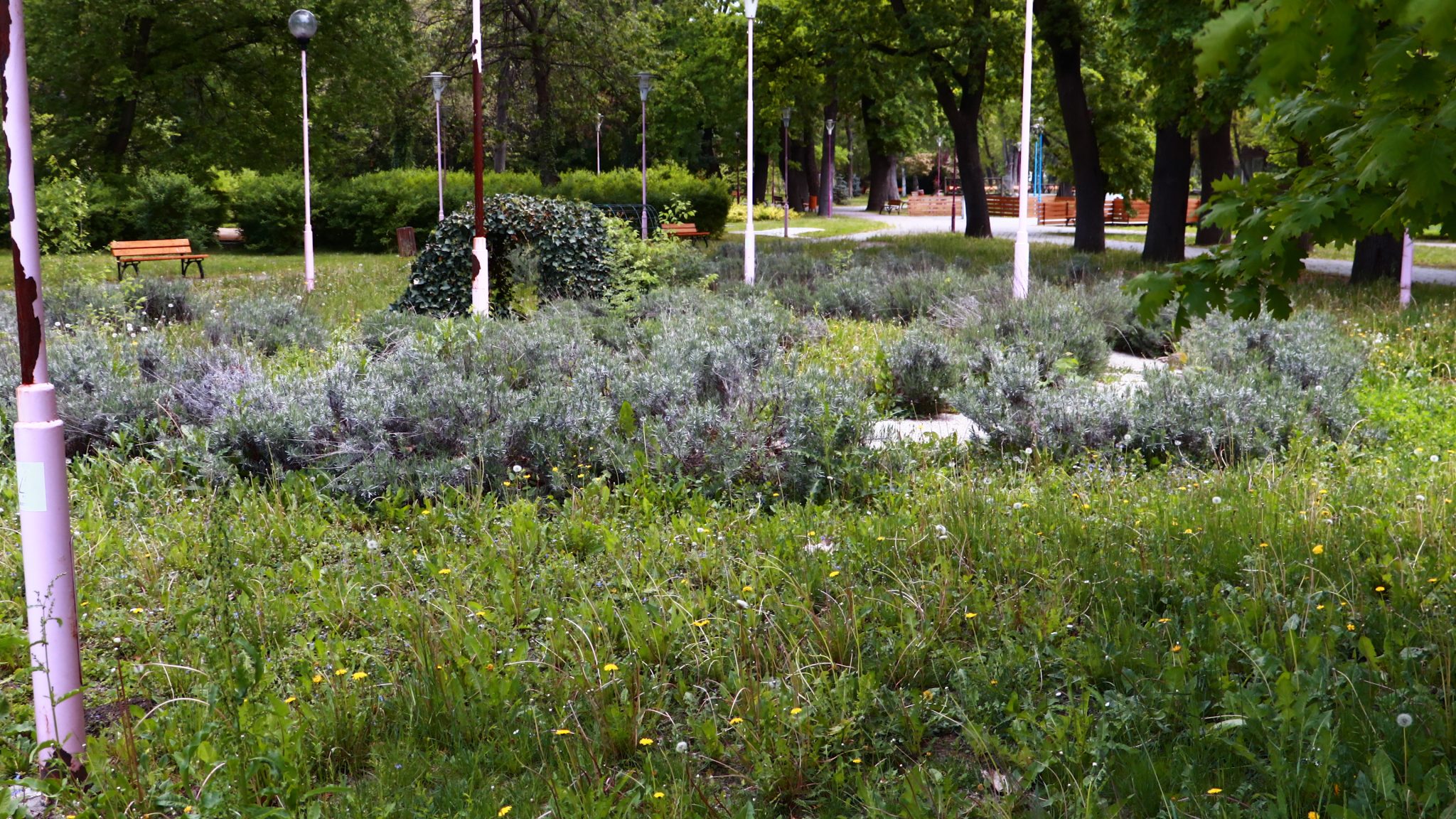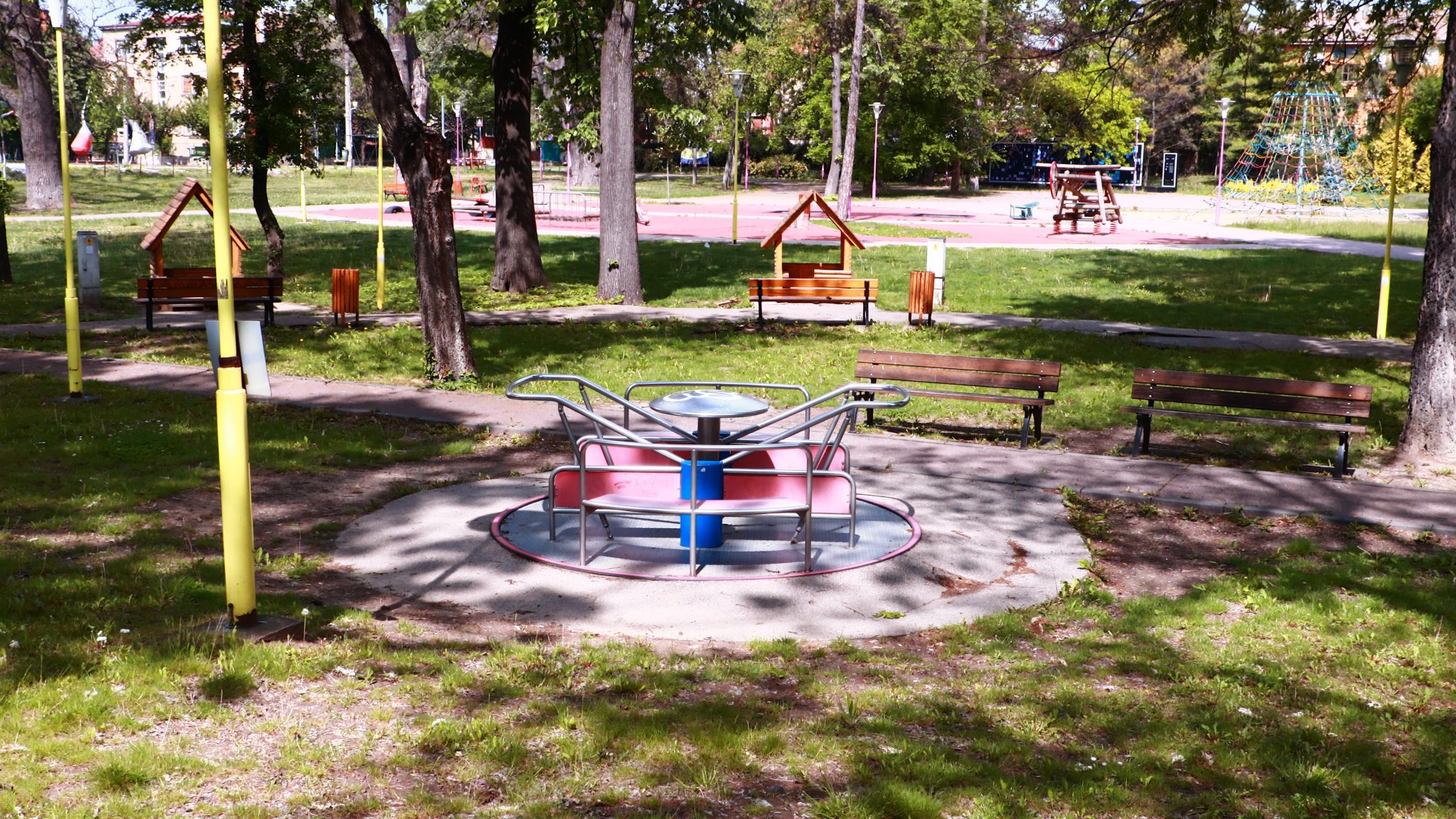 Doar coșurile de gunoi căzute la datorie ar mai trebui reparate ori schimbate. Apoi iarba tunsă la o dimensiune rezonabilă și treaba ar fi în regulă. Evident că accesul este interzis prin panglici alb-roșii, care delimitează zona pietonală de zona cu interdicții. Un trecător (cu siguranță vecin din cartier) intră în vorbă.