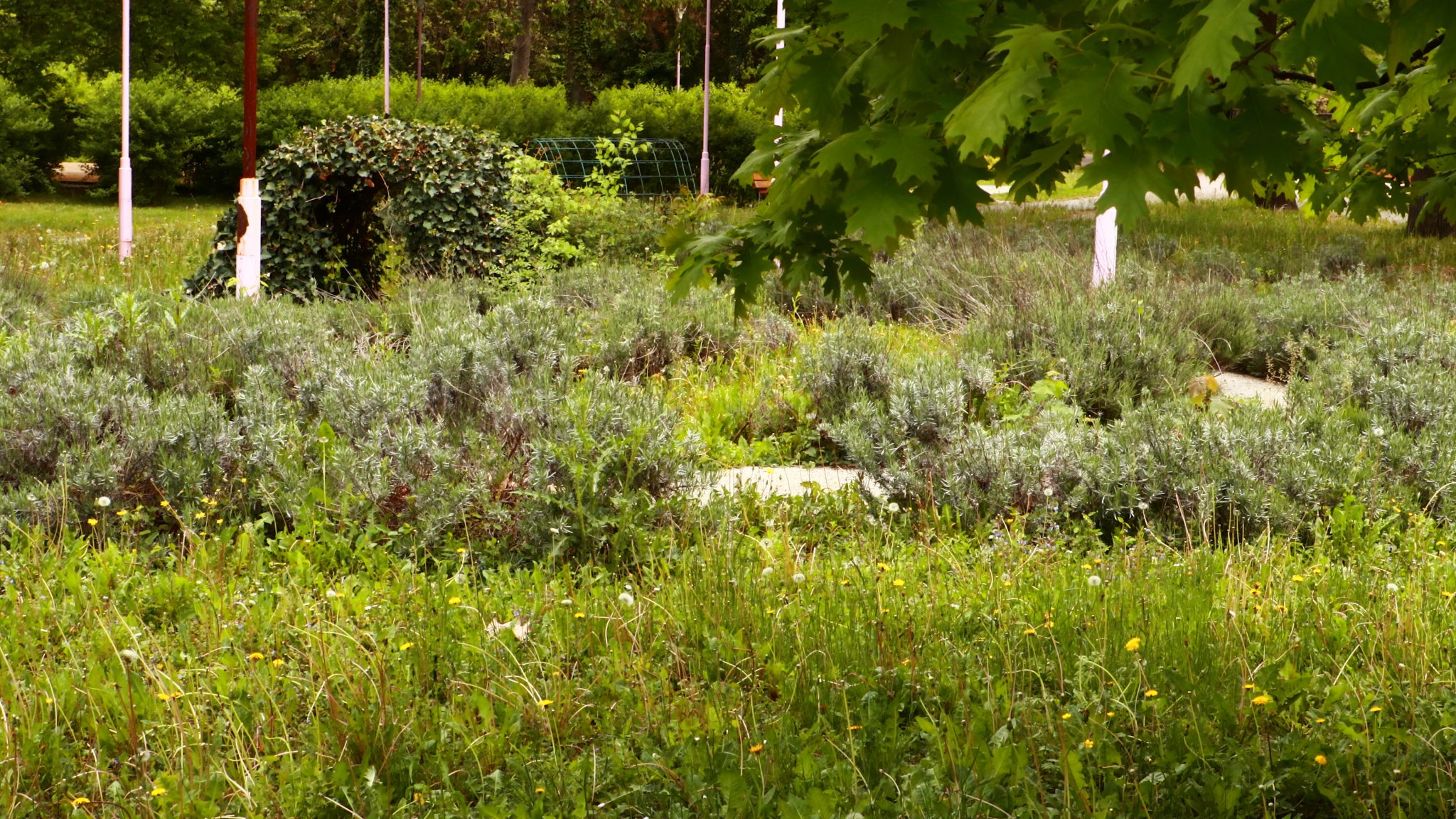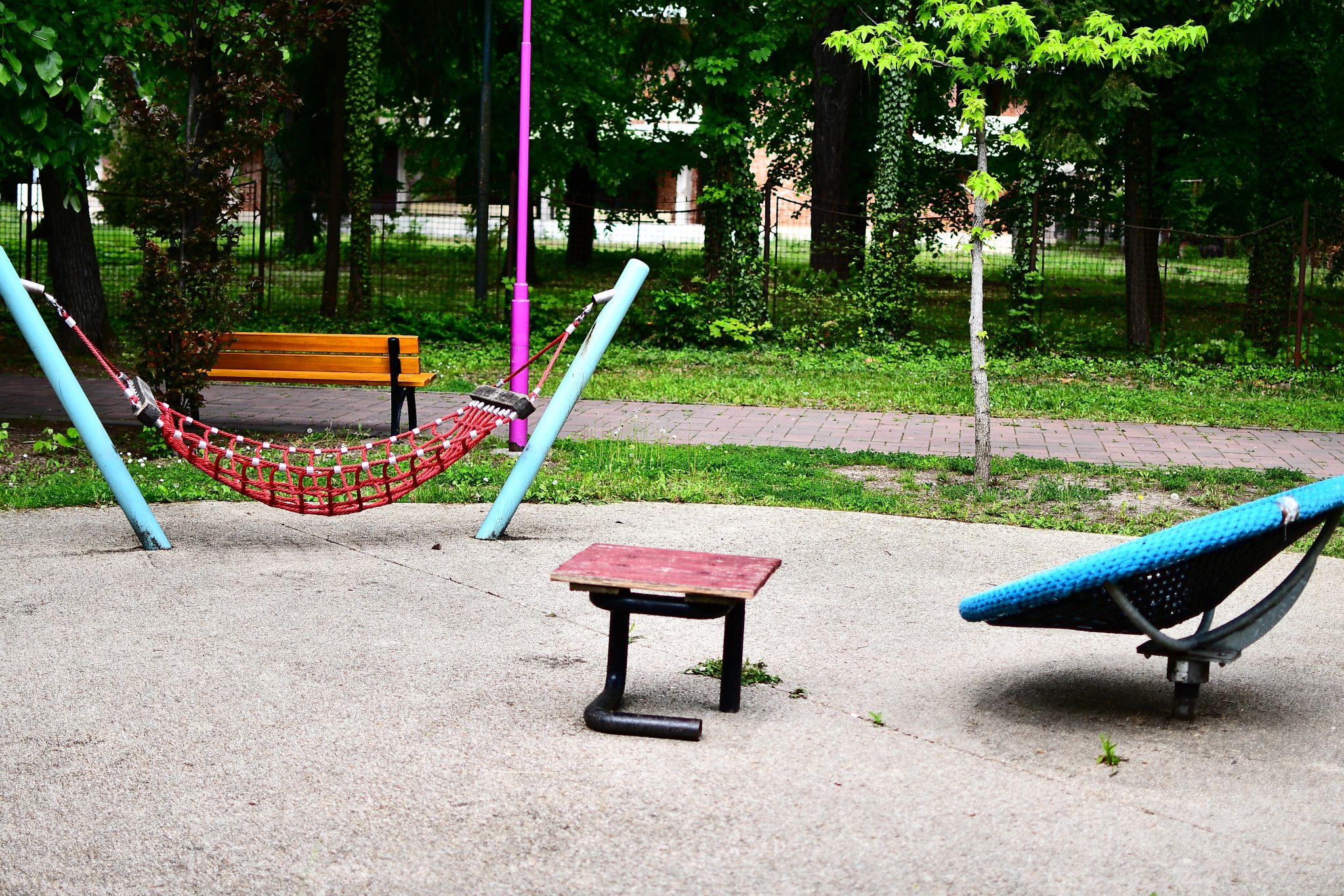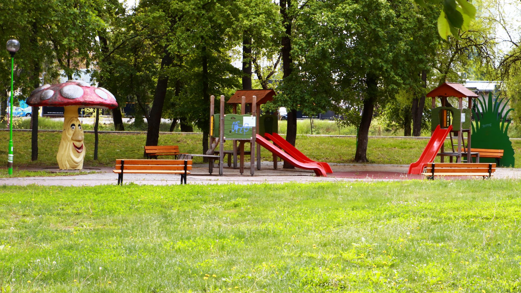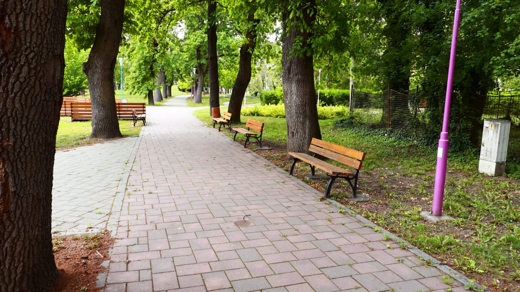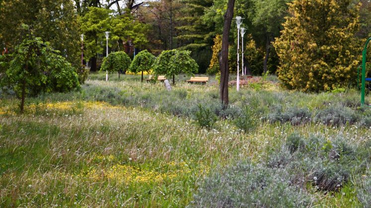 Doar coșurile de gunoi căzute la datorie ar mai trebui reparate ori schimbate. Apoi iarba tunsă la o dimensiune rezonabilă și treaba ar fi în regulă. Evident că accesul este interzis prin panglici alb-roșii, care delimitează zona pietonală de zona cu interdicții. Un trecător (cu siguranță vecin din cartier) intră în vorbă.