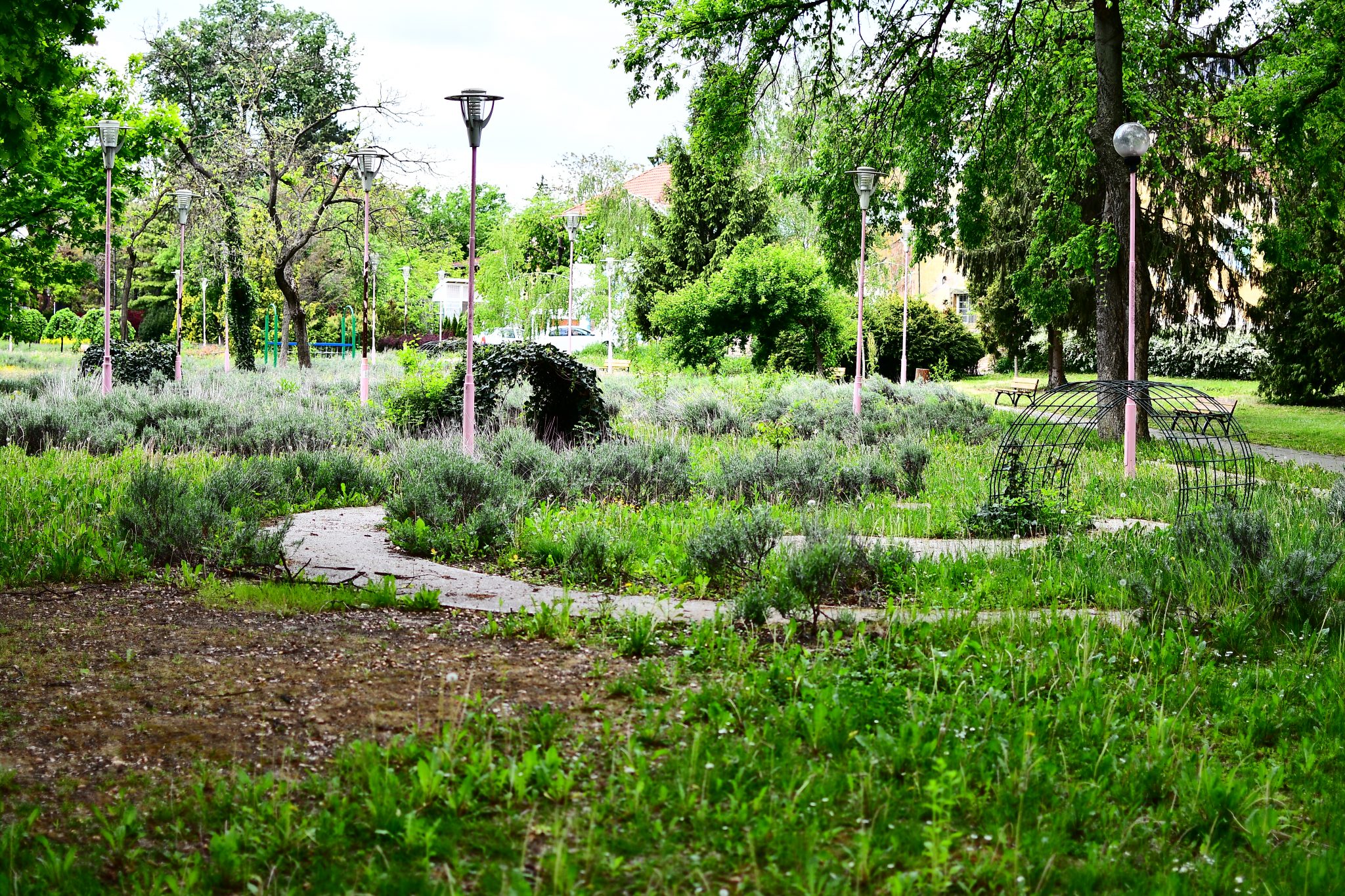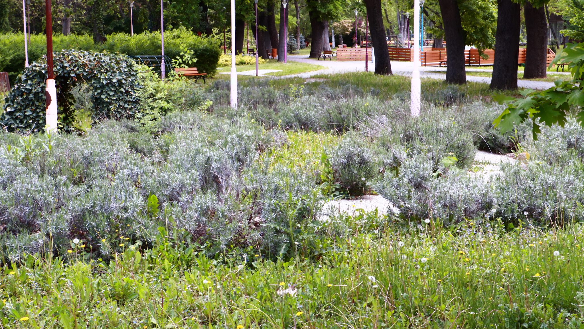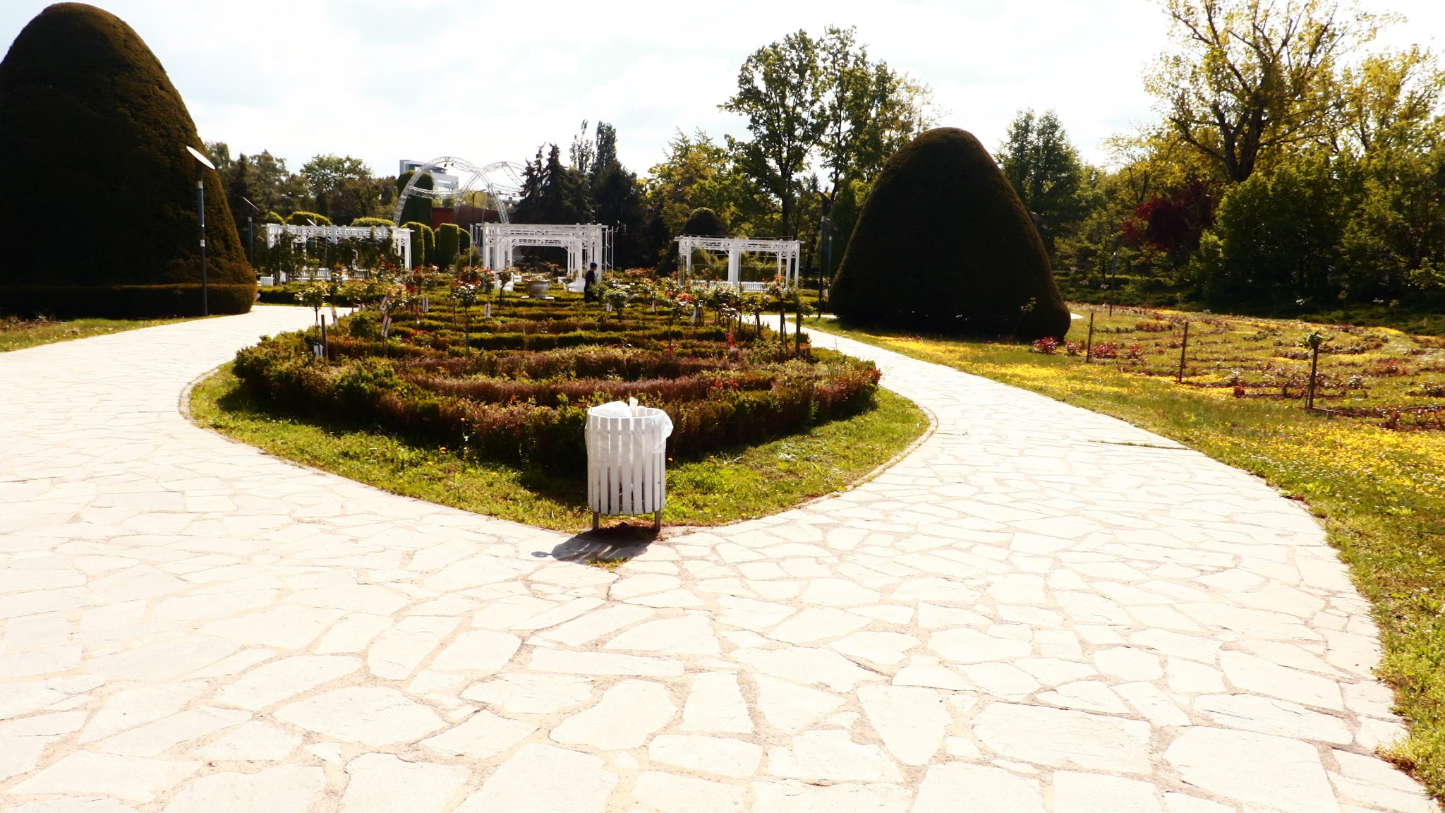 Peste drum în parcul emblemă al orașului, cel al „Rozelor” florile sunt în largul lor. Înfloresc, sunt verzi, unele sunt în floare, asemenea buruienilor ce se ițesc printre dalele de caldarâm. Dar totuși se vede ceva urmă de muncă. Câțiva saci de plastic plini cu iarbă și vocile unor doamne cu greble și sape arată că se întâmplă ceva.