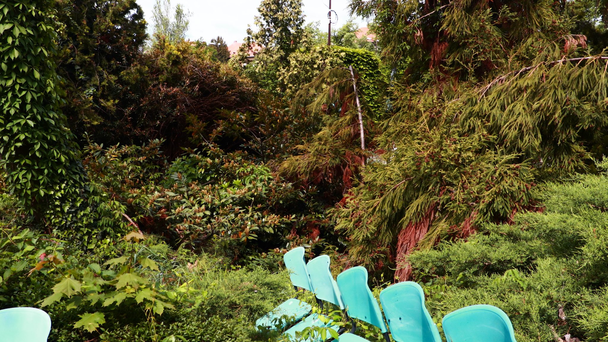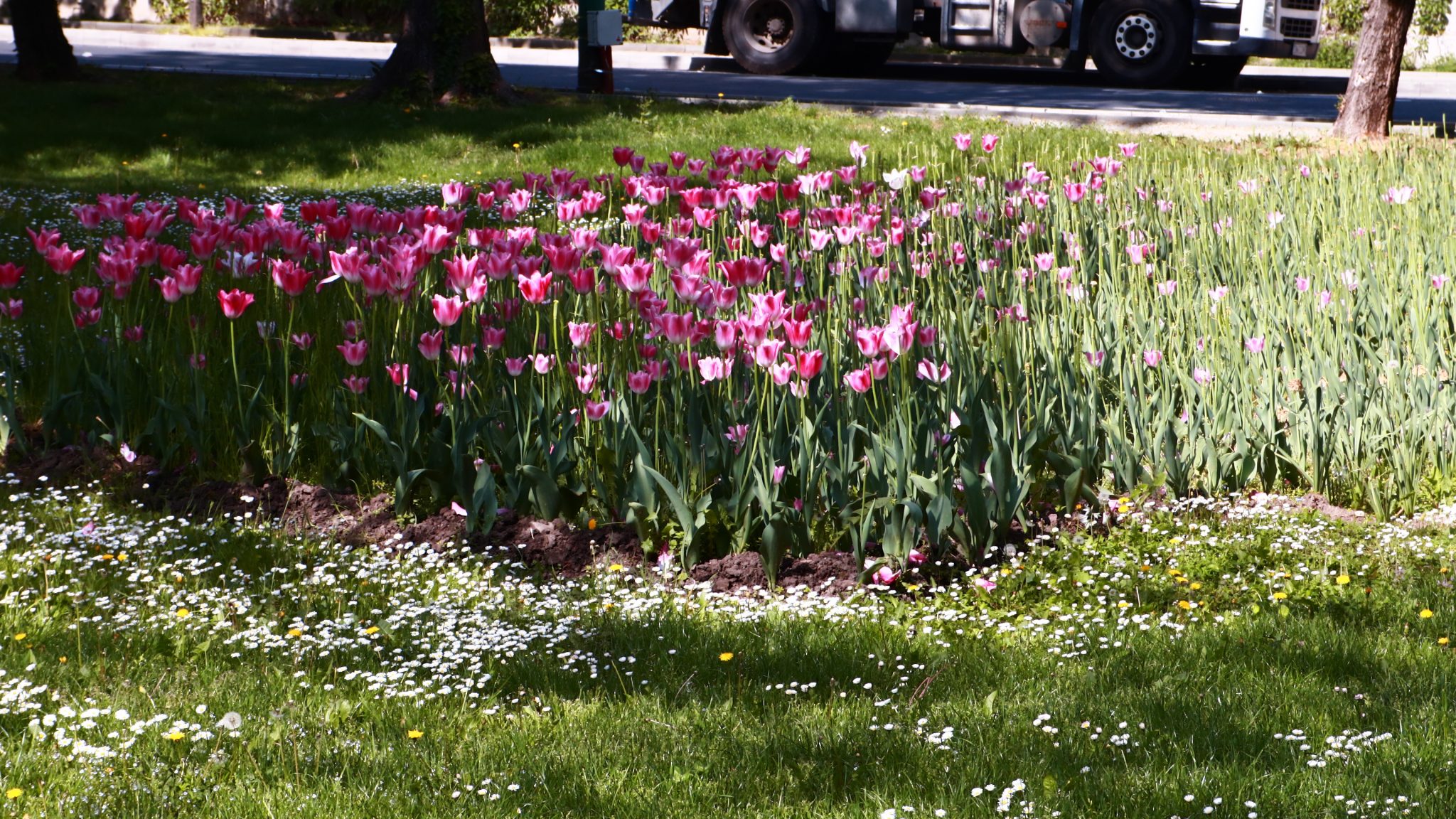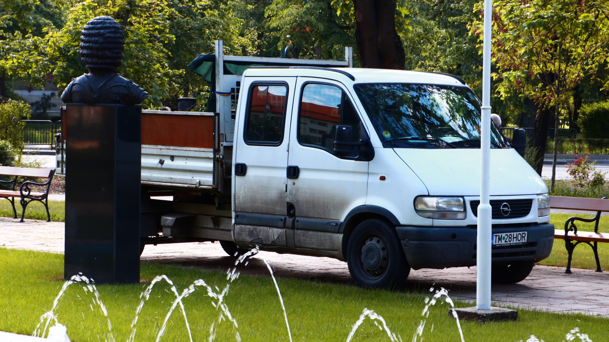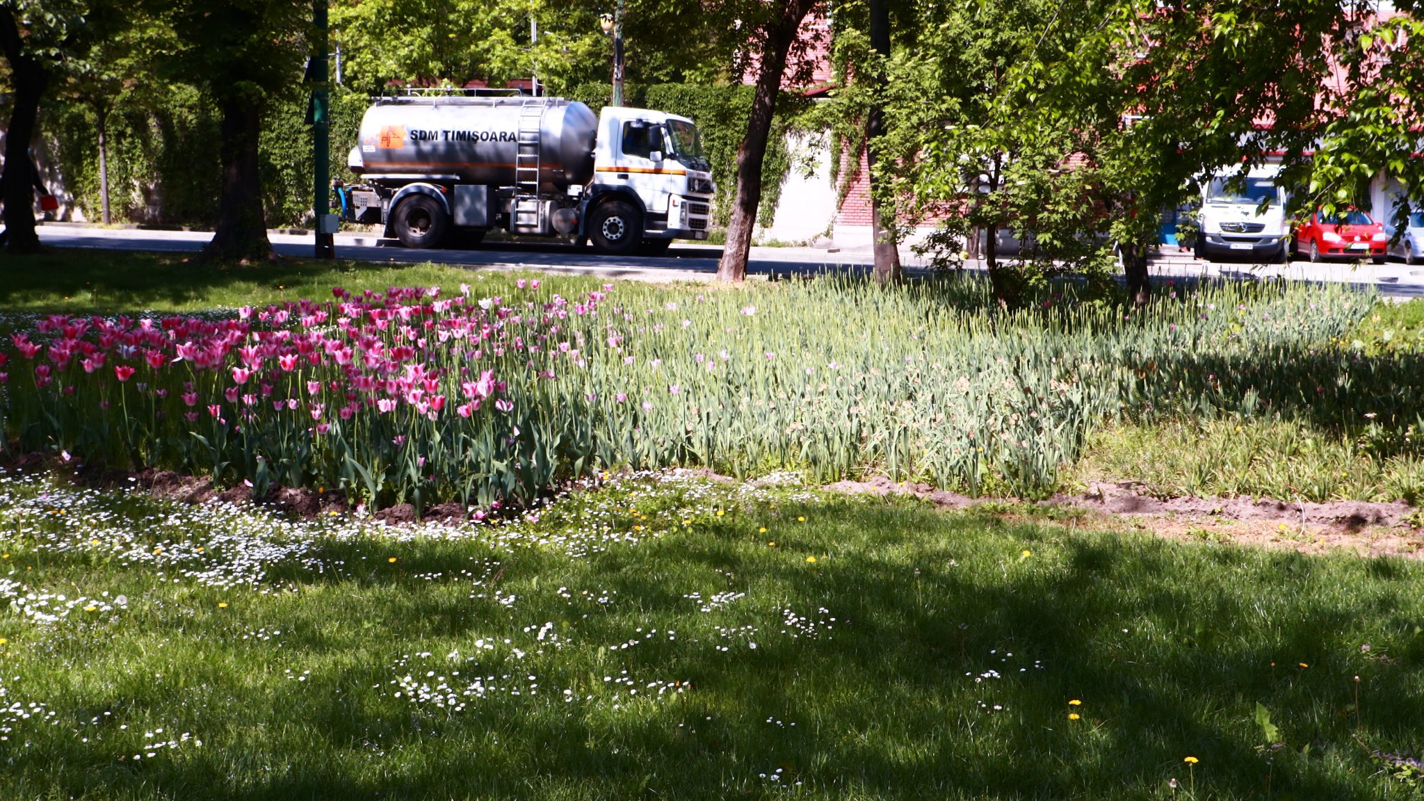 Peste drum în parcul emblemă al orașului, cel al „Rozelor” florile sunt în largul lor. Înfloresc, sunt verzi, unele sunt în floare, asemenea buruienilor ce se ițesc printre dalele de caldarâm. Dar totuși se vede ceva urmă de muncă. Câțiva saci de plastic plini cu iarbă și vocile unor doamne cu greble și sape arată că se întâmplă ceva.