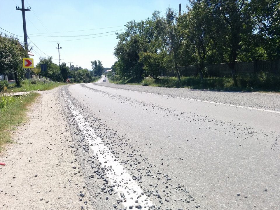 2) Conform normativului și rețetei pusă la dispoziție de CNAIR criblura aplicată este specificată ca fiind de sort 6-10mm. În realitate sortul folosit pare să nu corespundă (vezi foto cu mostre de pe DN6). Ce înseamnă asta? Dublă probabilitate mai mare de spargere a parbrizelor: pietricelele mai mari se înglobează mai greu în emulsie și au forță mai mare de impact.