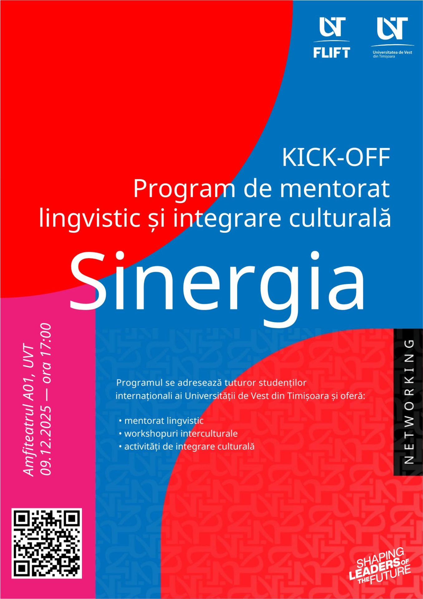 Universitatea de Vest din Timișoara (UVT), prin Facultatea de Litere, Istorie, Filosofie și Teologie, a lansat Programul de mentorat lingvistic și integrare culturală SINERGIA. La eveniment au fost prezenți un număr însemnat de studenți internaționali din UVT, alumni ai Programului pregătitor de limba română ca limbă străină pentru cetățenii străini, precum și studenți voluntari, dornici să fie parte din acest demers.