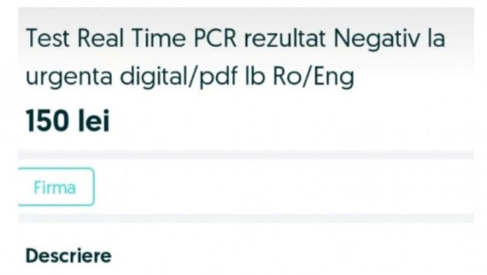În urma investigațiilor desfășurate a fost identificat un bărbat, fiind reținută în sarcina acestuia săvârșirea infracțiunii de fals material în înscrisuri private, stabilindu-se că acesta, în perioada ianuarie – până în prezent, ar fi postat pe un site mai multe anunțuri din conturi deschise cu date nereale, oferind spre vânzare teste PCR cu rezultat negativ, teste care nu se efectuau în realitate, ci doar se trimitea pe mail cumpărătorilor un document în care erau menționate datele cumpărătorului și rezultatul negativ, iar contravaloarea documentului se achita într-un cont bancar.