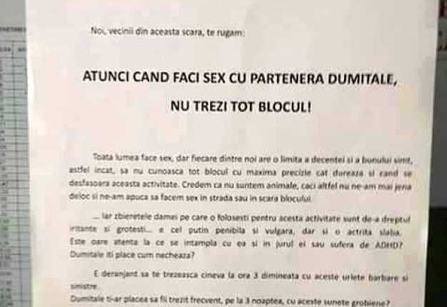 „Noi, vecinii din această scară, te rugăm: Atunci când faci sex cu partenera dumitale, nu trezi tot blocul! Toată lumea face sex, dar fiecare dintre noi are o limită a decenţei şi a bunului simţ, astfel încât să nu cunoască tot blocul cu maximă precizie cât durează şi când se desfăşoară o astfel de activitate. Credem că nu suntem animale, căci altfel nu ne-am mai jena deloc sau ne-am apuca să facem sex în stradă sau în scara blocului”, se arată în afişul devenit viral pe Internet.