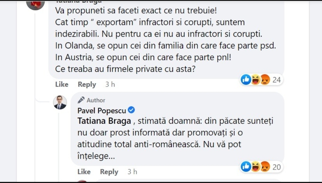 Într-un răspuns la un comentariu critic, Pavel Popescu acuză o persoană de „atitudine antiromânească”.
