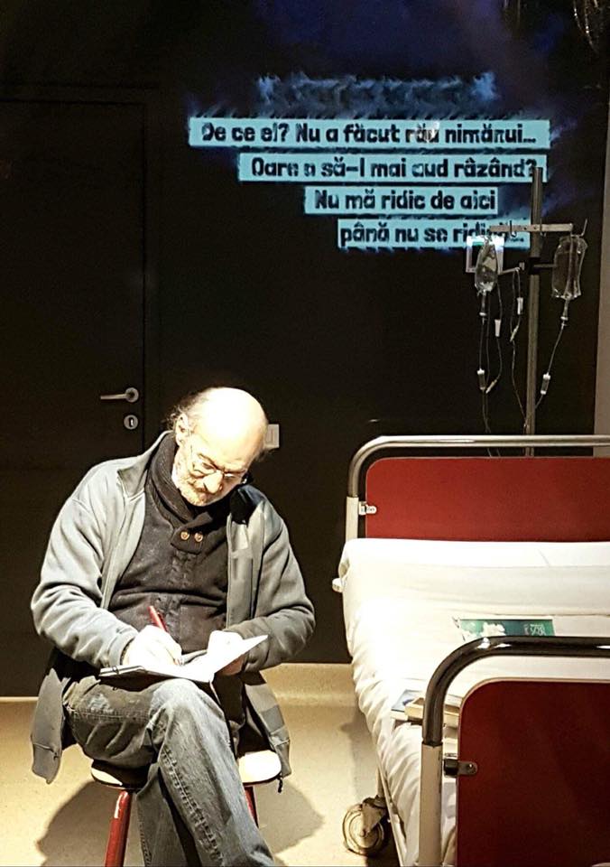 In trei dintre pozele de mai jos este Jean Chelba, acum cateva minute. Textul de pe perete este intamplator, dupa cum intamplator este si faptul ca cel care il inlocuieste pe scaun este un tanar medic rezident. Si ca Jean il imbratiseaza. Sau poate nimic din toate astea nu este intamplator. Nu stiu.
