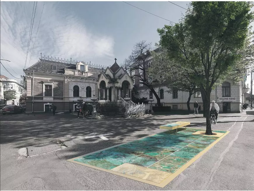 „Ideea moștenirii Revoluției, această respirație liberă a noastră, a condus și la ideea de a alege culoarea turcoaz pentru a marca intervențiile care fac obiectul proiectului. Ideea de a marca pământul cu o culoare apropiată de a cerului este un mod de a celebra acest moment eroic. Materialele propuse în proiect, granit turcoaz și bronz, asigură rezistența și durabilitatea intervențiilor”, este justificarea firmei de arhitectură.