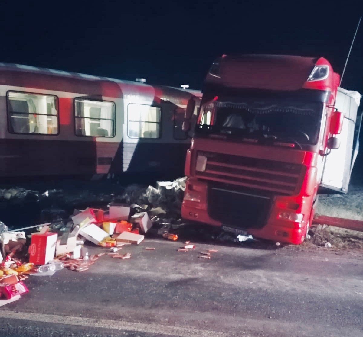 Șoferul camionului nu s-a asigurat la trecerea la nivel de pe DN59C și a intrat în coliziune cu garnitura. Din fericire, nu au fost victime.
