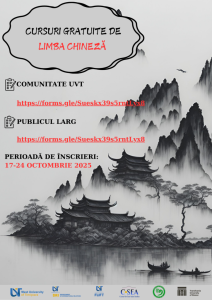 Cursurile de limbă chineză sunt oferite gratuit și se adresează atât membrilor comunității UVT (studenți, personal academic și administrativ, precum și copiilor acestora), cât și membrilor comunității locale, interesați de limba și cultura chineză, în special, dar și de a începe să exploreze Asia. Cursurile vor fi structurate pe niveluri în funcție de nivelul anterior de cunoaștere a limbii chineze (începător, intermediar, avansat) și se vor desfășura săptămânal, în module de câte o oră și jumătate, începând cu data de 3 noiembrie 2025. Pe lângă oportunitatea exclusivă de a dobândi cunoștințe de comunicare în această limbă, lectorii își propun și integrarea unor elemente culturale menite să stârnească entuziasmul și curiozitatea participanților.