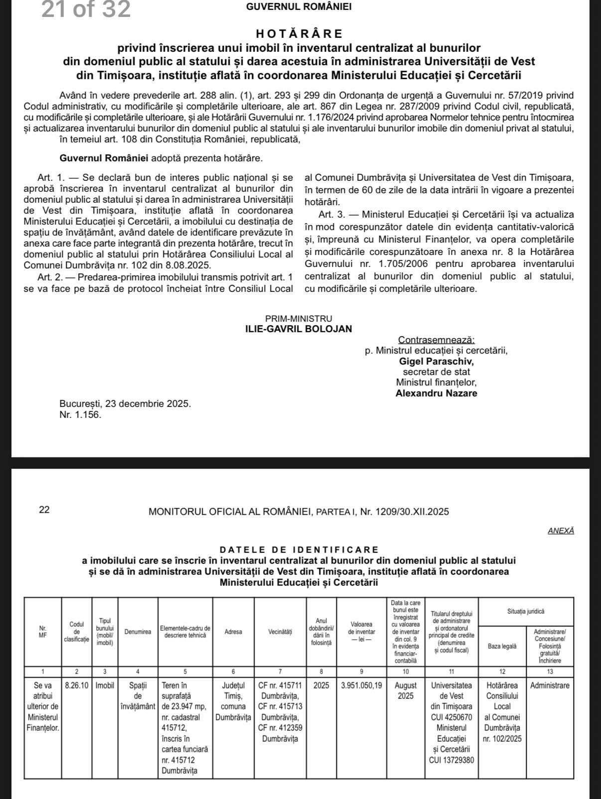 Prin Hotărârea de Guvern nr. 1.156 din 23 decembrie 2025, publicată în Monitorul Oficial al României, Universitatea de Vest din Timișoara (UVT) a primit în administrare un teren în suprafață de 23.947 mp, cu destinația de spațiu de învățământ. Imobilul a fost transferat în domeniul public al statului prin Hotărârea Consiliului Local al Comunei Dumbrăvița nr. 102 din 8 august 2025, demers realizat în cadrul parteneriatului instituțional dintre UVT și UAT Dumbrăvița, în vederea dezvoltării infrastructurii educaționale în zona metropolitană Timișoara.